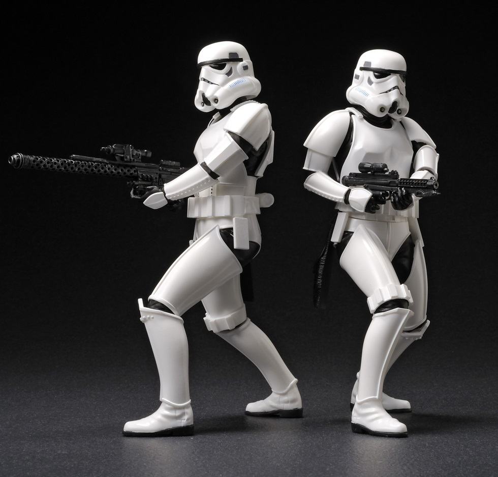 Stormtrooper Build Pack contains two Stormtrooper figures. The set comes with interchangeable four arm parts and two leg parts, giving you the option of 18 different pose combinations! Like the other ARTFX+ statues, the Stormtroopers also have magnets in their feet for display on the included bases. The Stormtroopers stand nearly 8" H (1/10th-scale) and are the perfect back-up for the Darth Vader ARTFX+ statue!