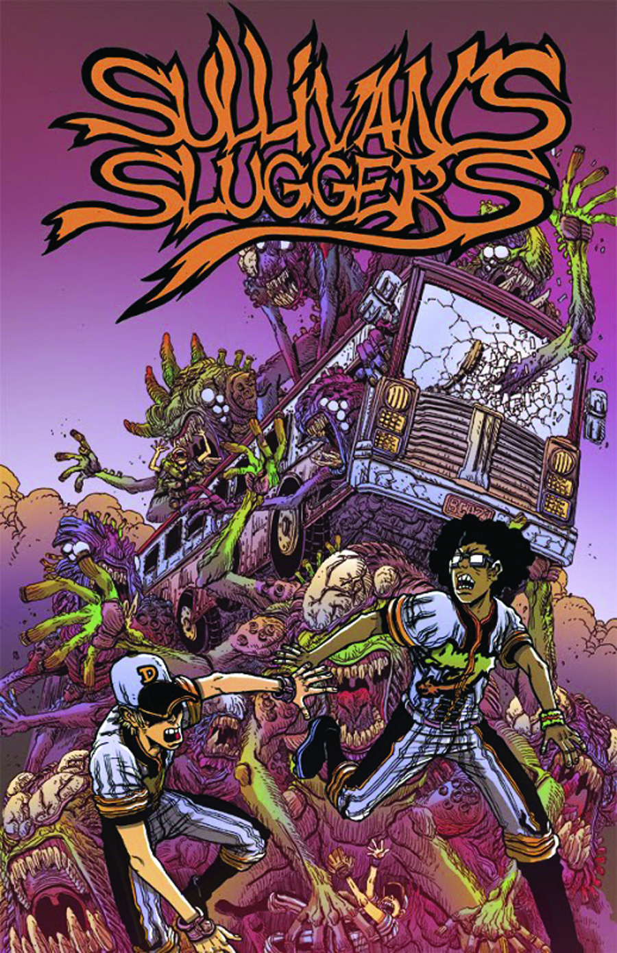 Sullivan's Sluggers comes in a slipcase, a print on the inside front cover, a baseball card sheet, danging ribbon boomkar, and a three page monster gate fold.