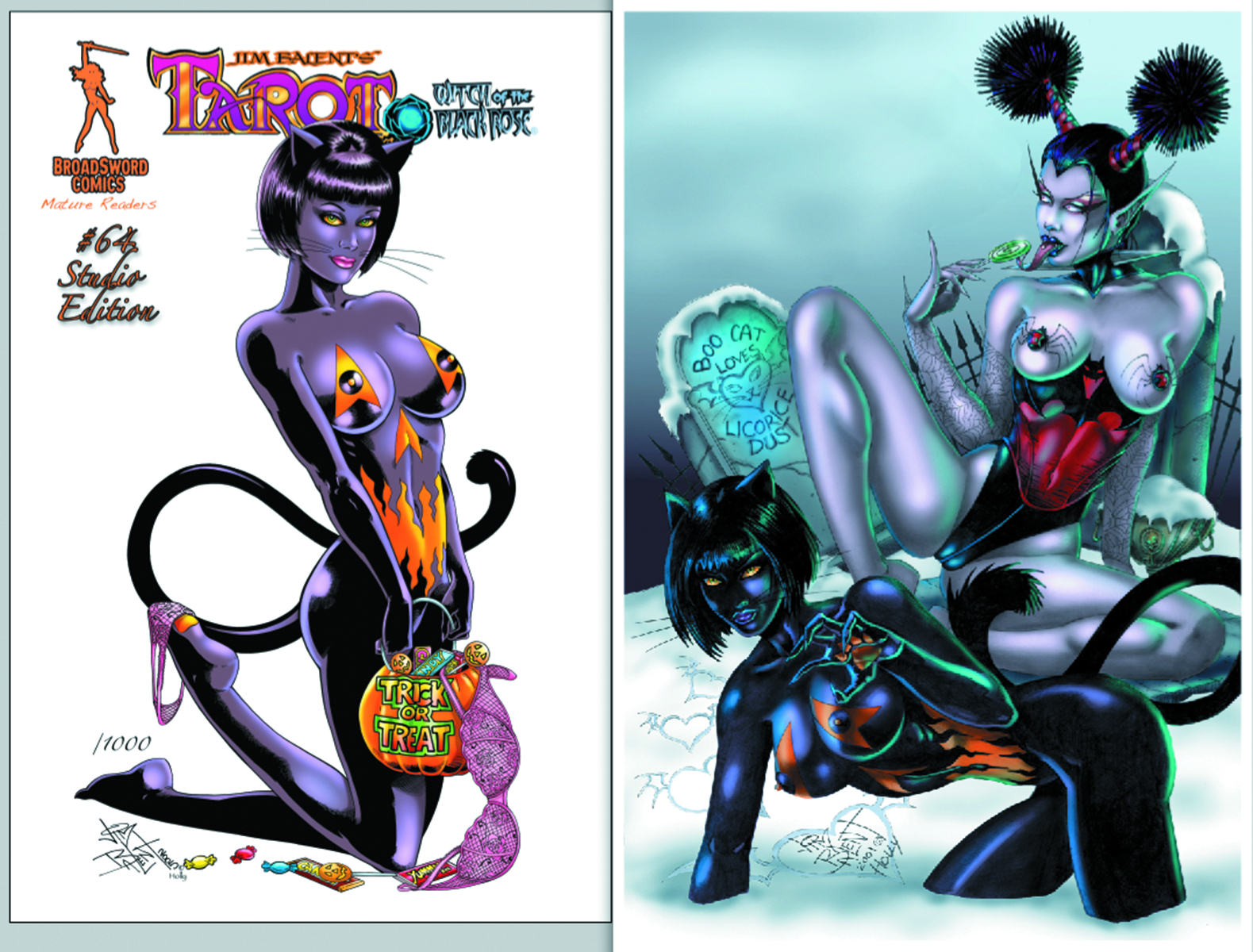 Tarot #64 will be signed by Jim Balent and comes bagged and boarded with a full color art print of Boo Cat and Licorice Dust!