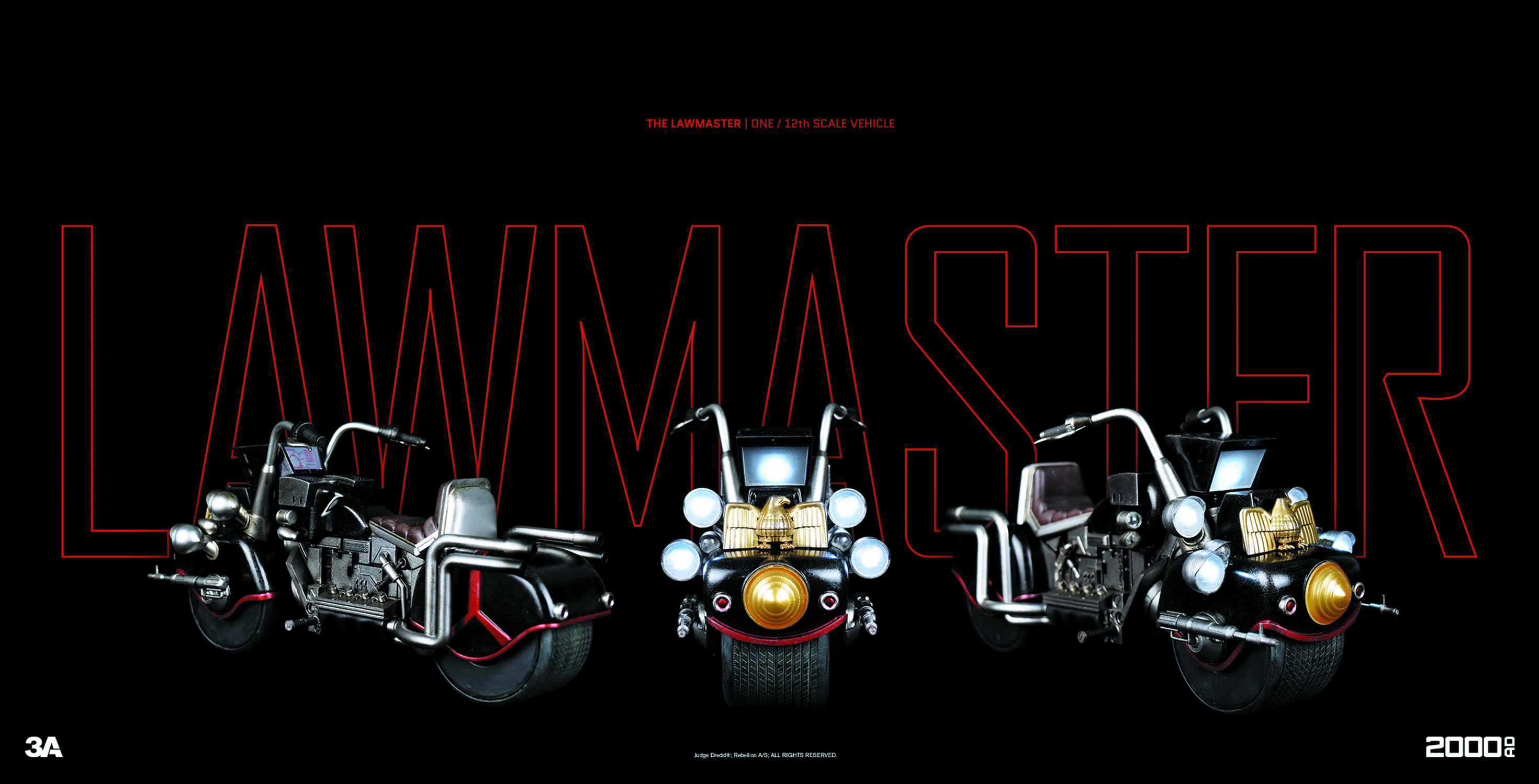 Lawmaster is a Judge's best defense on the violent streets of Mega-City One. The 3A Modified MK1 comes armed with Mike McMahon-styled Bike Cannons to take down creeps and blaze a trail across the Cursed Earth. The Lawmaster features a vintage silhouette; LED illuminated headlamp, side lights and onboard computer display (requires 7 AG1 button cell batteries, not included); rubberized soft vinyl tires; and, at 9.45" long, is able to fit 1/12-scale collectible figures. A classic approach to one of the most iconic vehicles in comics history, blending in all the detail and weathering 3A are known for.