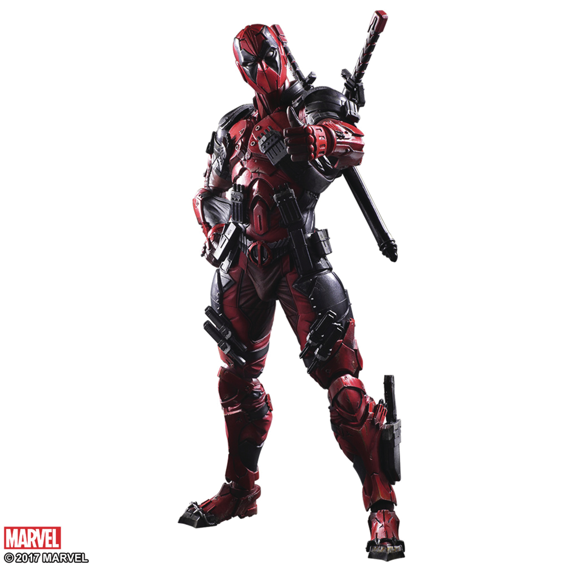Deadpool, based on Marvel Comics' most unconventional anti-hero, descends upon us as a Play Arts Kai action figure! Three interchangeable head pieces featuring different facial expressions and a variety of interchangeable hands are included so the collector can enjoy Deadpool's comical and expressive character. With a wide range of motion, it is easy to recreate poses from mischievous gestures to powerful action stances. The paintwork keeps in line with the image of Deadpool portrayed in the film, with the application of deep red gradation on top of a more vivid metallic color. The weathering effects on the armor evoke the sharp contrast between Deadpool's silly attitude and serious badassery.