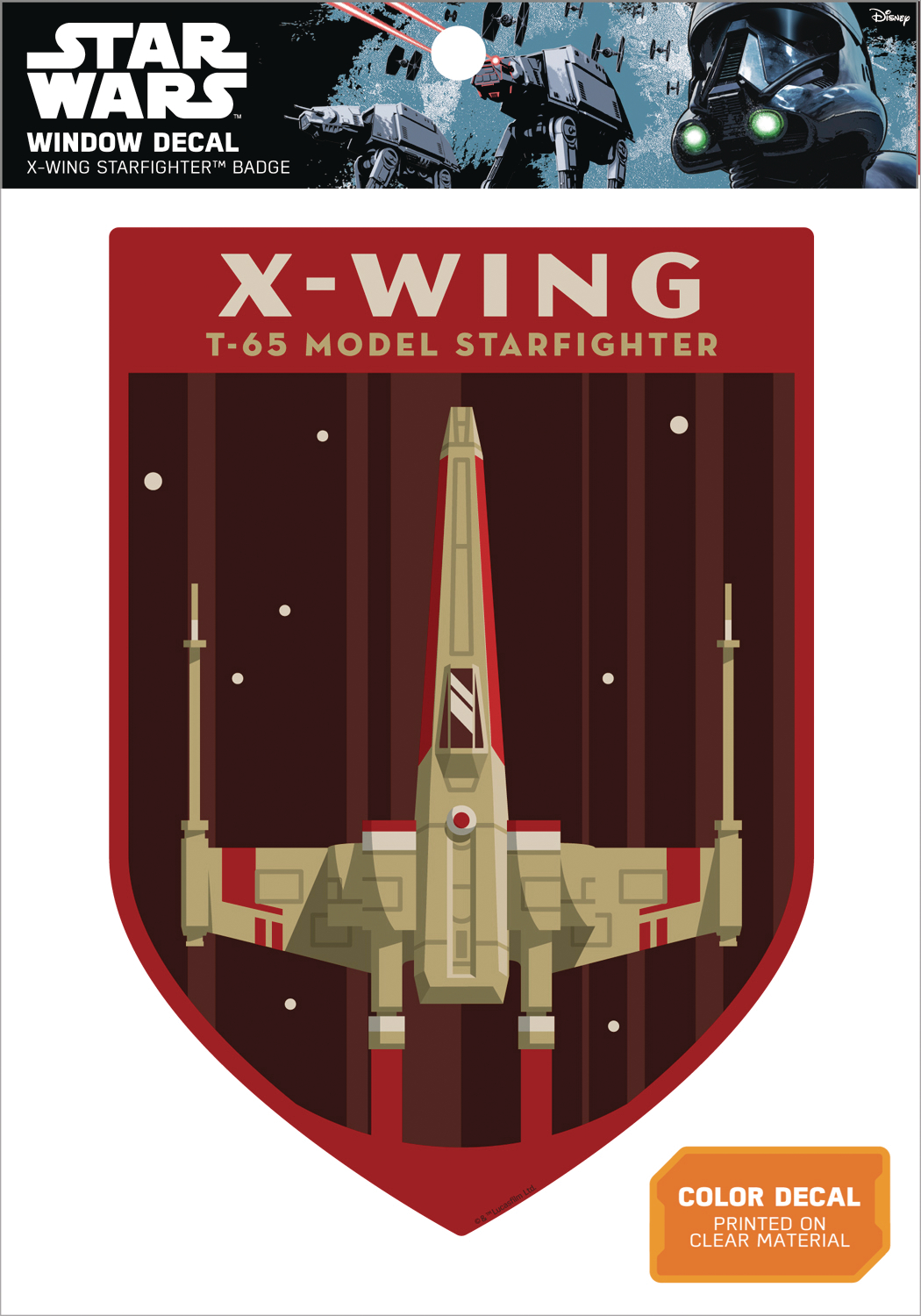 Star Wars X-Wing Starfighter Badge Window Decal has been designed to look like a cool retro advertisement for the X-Wing fighter. Badge measures 7 1/2-inches tall x 5 1/4-inches wide. FanWraps window decals are made of a clear poly window film printed in full color to produce eye popping visuals. Features DIY installation, automotive grade materials. Decal is UV and water resistant, designed for window use only with clean removability.
