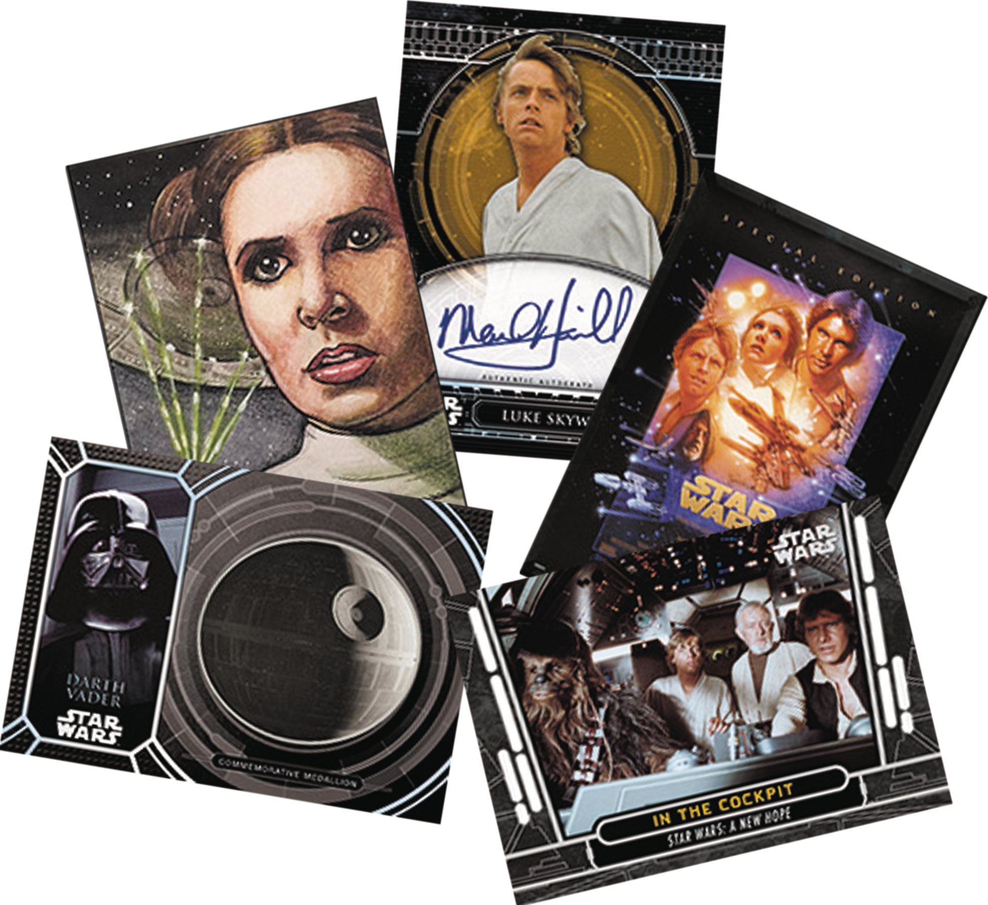 Star Wars, the celebration is bound to be big. Part of that is the release of 2017 Topps Star Wars 40th Anniversary trading cards Which features a 200 card base set that recaps many plots from across the movies and television shows. Also featured are Autographs, premium inserts such as printing plates, buyback hits, medallions and sketch cards, as well as Parallels. 8 cards per pack, 24 packs per box.