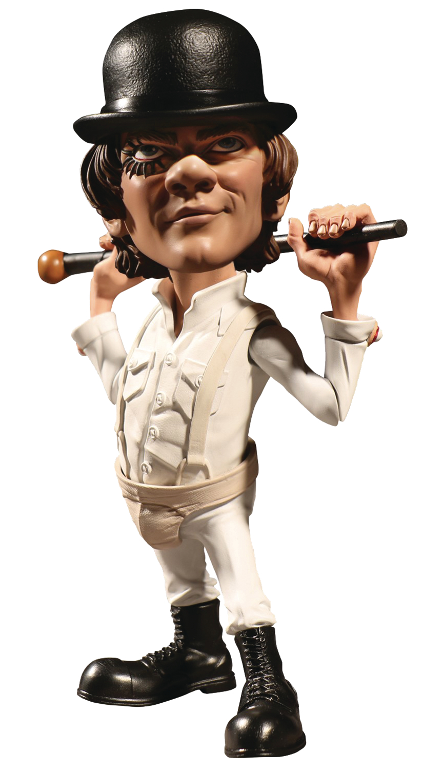 A Clockwork Orange is Alex, leader of the Droogs. The latest character addition to Mezco's signature super-deformed style, Alex is presented in his now iconic white outfit with eyeball cufflinks, suspenders and athletic protector. Also sporting his trade mark bowler hat, walking cane. Of course Alex has eye liner and his sinister smirk as well. Standing approximately 6" tall, the