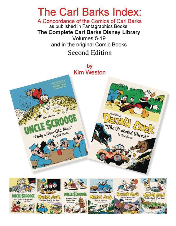 The Complete Carl Barks Disney Library. Each of the almost 9,500 data entries in the Index includes reference to the original USA comic book publications, with comic book title, issue, and story page numbers. It also includes reference to Fantagraphics' hardcover books including volume, and page number, as well as submission dates, based on Carl Barks' personal work records. The regular and large print editions are identical in content except for the print size and formatting of the Index portion of the book. The Index covers volumes 5-19 in the Fantagraphics series, all in print as of September 2018.