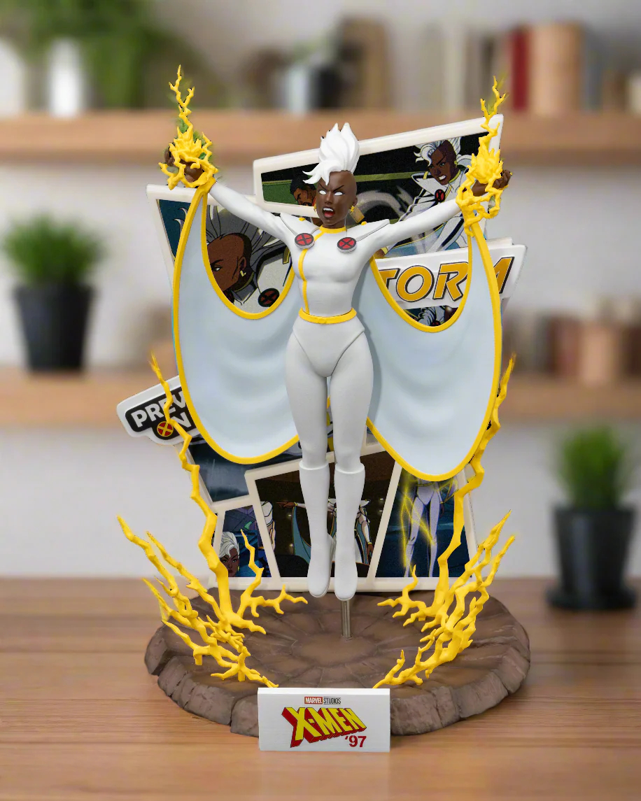 This collectible uses refined 3D sculpting to recreate her classic look. She wears a white bodysuit with a white cape lined in deep blue and trimmed in bright yellow, flowing with dynamic elegance. Her signature white hair and glowing eyes capture the stunning moment of lightning summoning. The base features semi-transparent lightning effects that amplify the sense of power, while the backdrop mimics comic panel design with a raised "STORM" nameplate-blending nostalgia and visual impact into a collector's masterpiece.