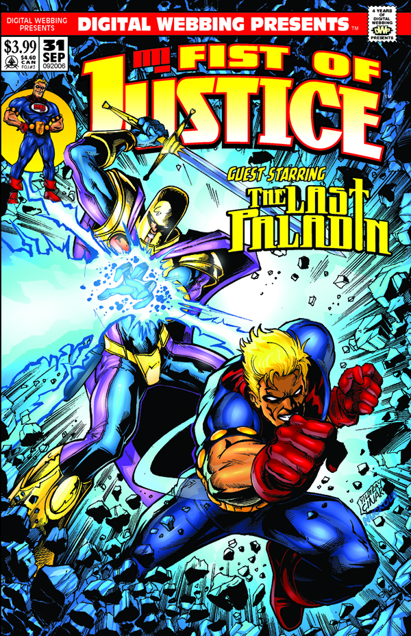 The Fist of Justice continues! In the tradition of classic team-ups of yesteryear, the Fist of Justic goes toe-to-toe with the Last Paladin until they discover they have a common enemy, an Atlantean War Machine. But who is controlling this metallic menace? You'll be shocked to find out!