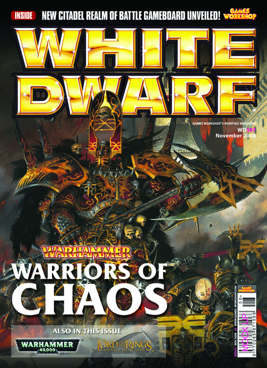 Warriors of Chaos Army Book, featuring the Warriors of Chaos Battalion, Knights, Chosen, and Marauder Horsemen, as well as gaming boards and new collector models. Also: An interview with Dave Andrews and Dave Cross about the new gaming boards, some scenario ideas, and painting tips. Plus: "Tale of 4 Gamers" - the mini-league commences, with all players battling each other in a 1500-point game, enhanced by newly painted models for their armies!; Painting Workshop: Space Marines, Painting Masterclass: Captain Sicarius.