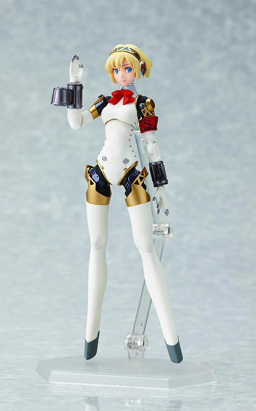 Persona 3, using Anti-Shadow special android, Aigis. The figures comes with Three expressions included - a "normal" face, a "smiling" face, and an "angry" face. The machine guns that attach to both arms can be attached and removed, and her "Rocket Punch" arm is also included. Clear parts that can be attached to the bottom of the feet allow her to stand without a figma stand. Window box packaging.