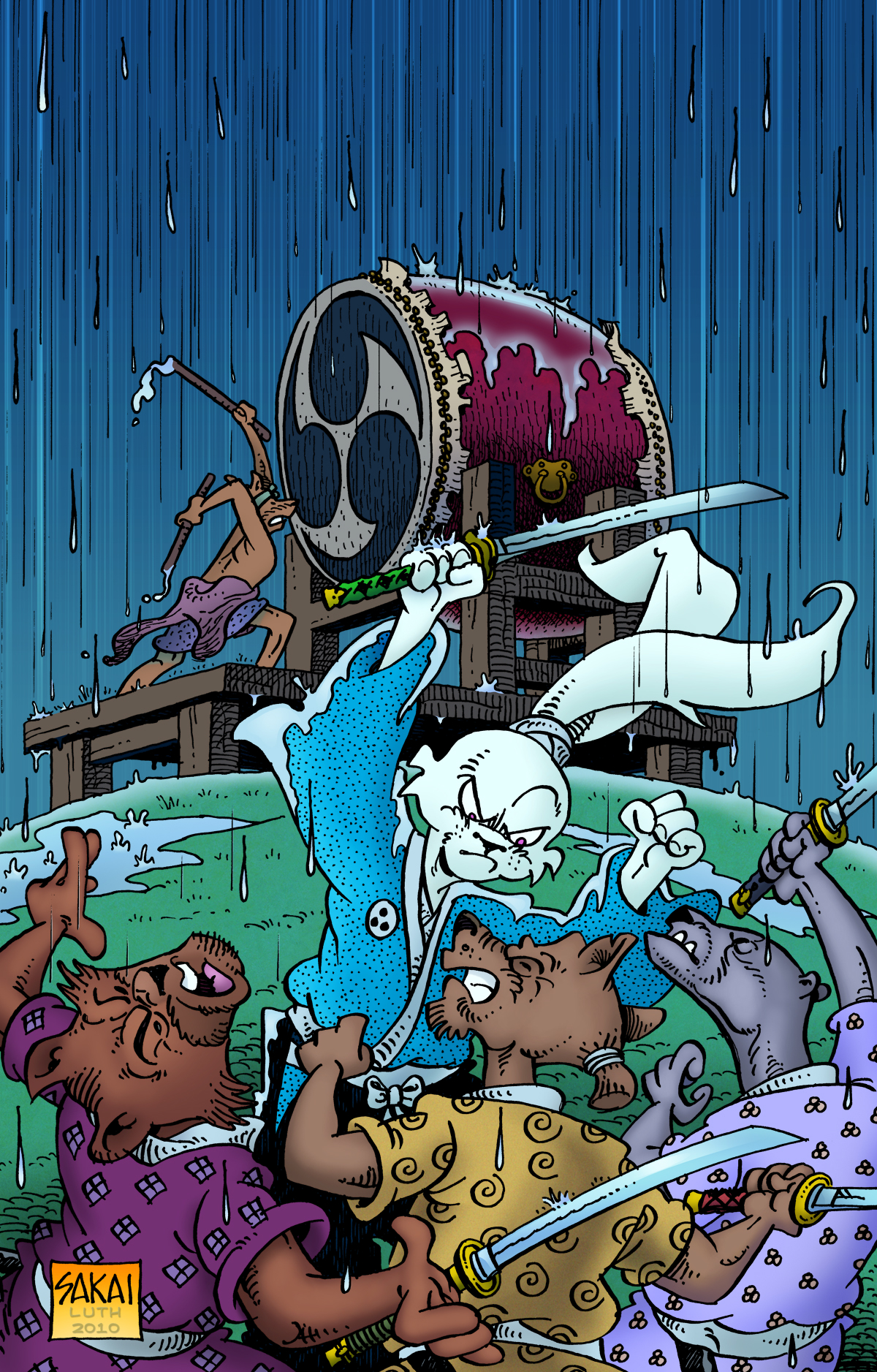 These issues form both halves of "Taiko," a special double-issue story line. A group of drought-stricken farmers commission an enormous taiko drum to show their devotion to the gods, and pray for rain. But the bloodthirsty Red Scorpion Gang threatens to destroy the drum unless the farmers pay up, so the farmers must turn to rabbit ronin Usagi to protect the drum, lest they face starvation from drought! When the Red Scorpion Gang burns down the farmers' temple and the drum is in jeopardy, Usagi must figure out how to rescue it and fight the Red Scorpions at the same time, or all is lost!