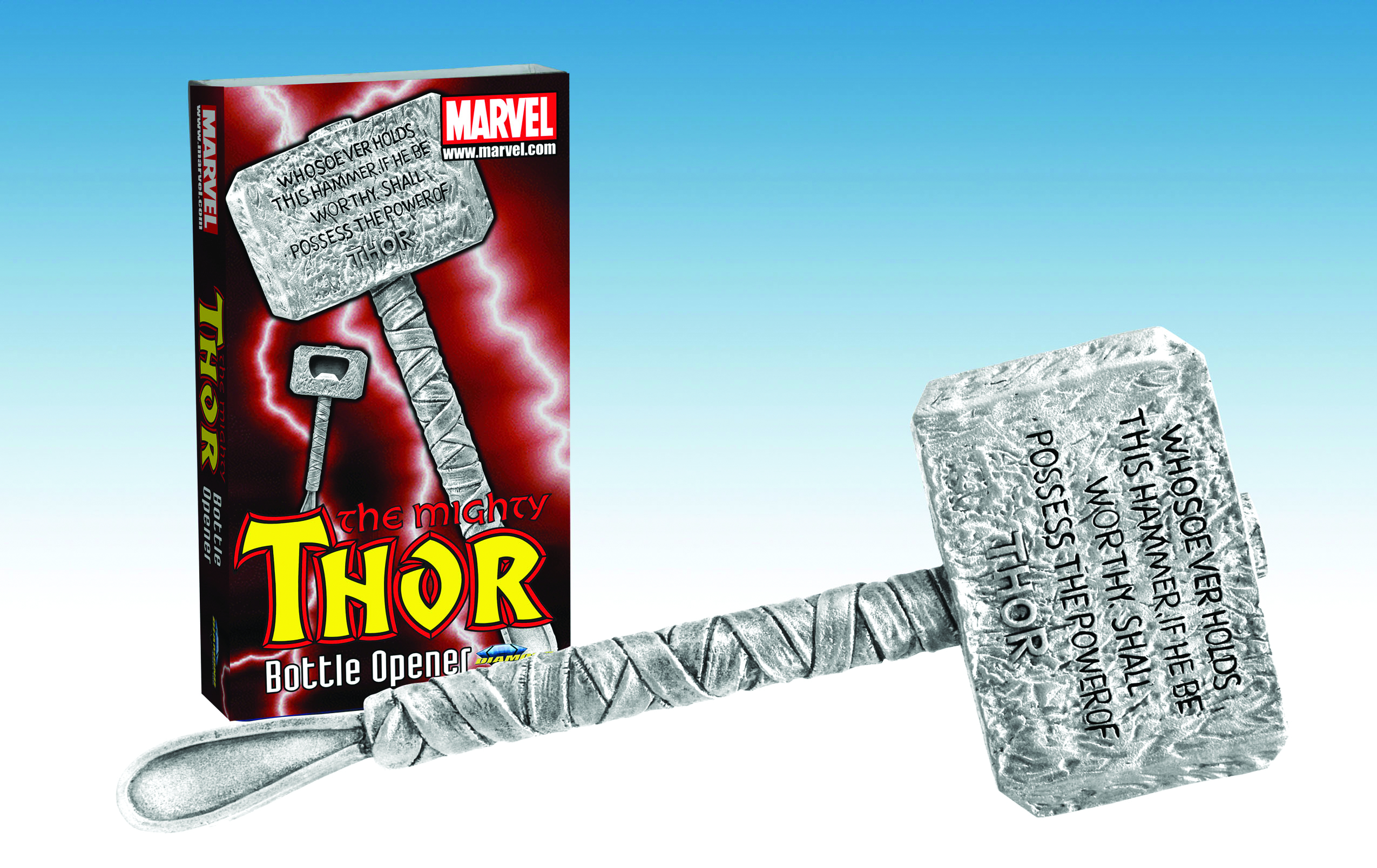 A Diamond Select Release! The first ever Mjolnir bottle opener! Now you don't need to be worthy to wield the Thunder god's hammer - you just need to be thirsty! Crafted in solid metal, this surefire conversation piece should be in every comic fan's kitchen. Perfect for when your guests want a cold beverage, and simply crying out "Make Mine Marvel" won't do the trick! Measuring six inches long from the hammer's head to the end of the handle, this original DST design is packaged in a full-color wrap encompassing a deluxe collector's case.