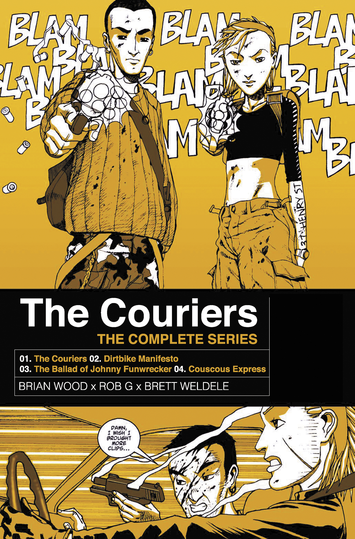 Collecting the complete four-volume saga, including the prequel graphic novel, Couscous Express, this epic story from 2002-2005 is the hyper-violent, tongue-in-cheek tale of mercenary bike messengers in New York City who do the jobs no one else will: the black market runs, the smuggling, the hits and the double crosses. THE COURIERS COMPLETE COLLECTION represents the bulk of creator-writer BRIAN WOOD's (DMZ, Demo, The Massive, The X-Men) early-'00s work, and with artwork by ROB G (Teenagers From Mars, REPO, Detective Comics) and BRETT WELDELE (The Surrogates, Southland Tales) it's a crucial addition to any reader's bookshelf.