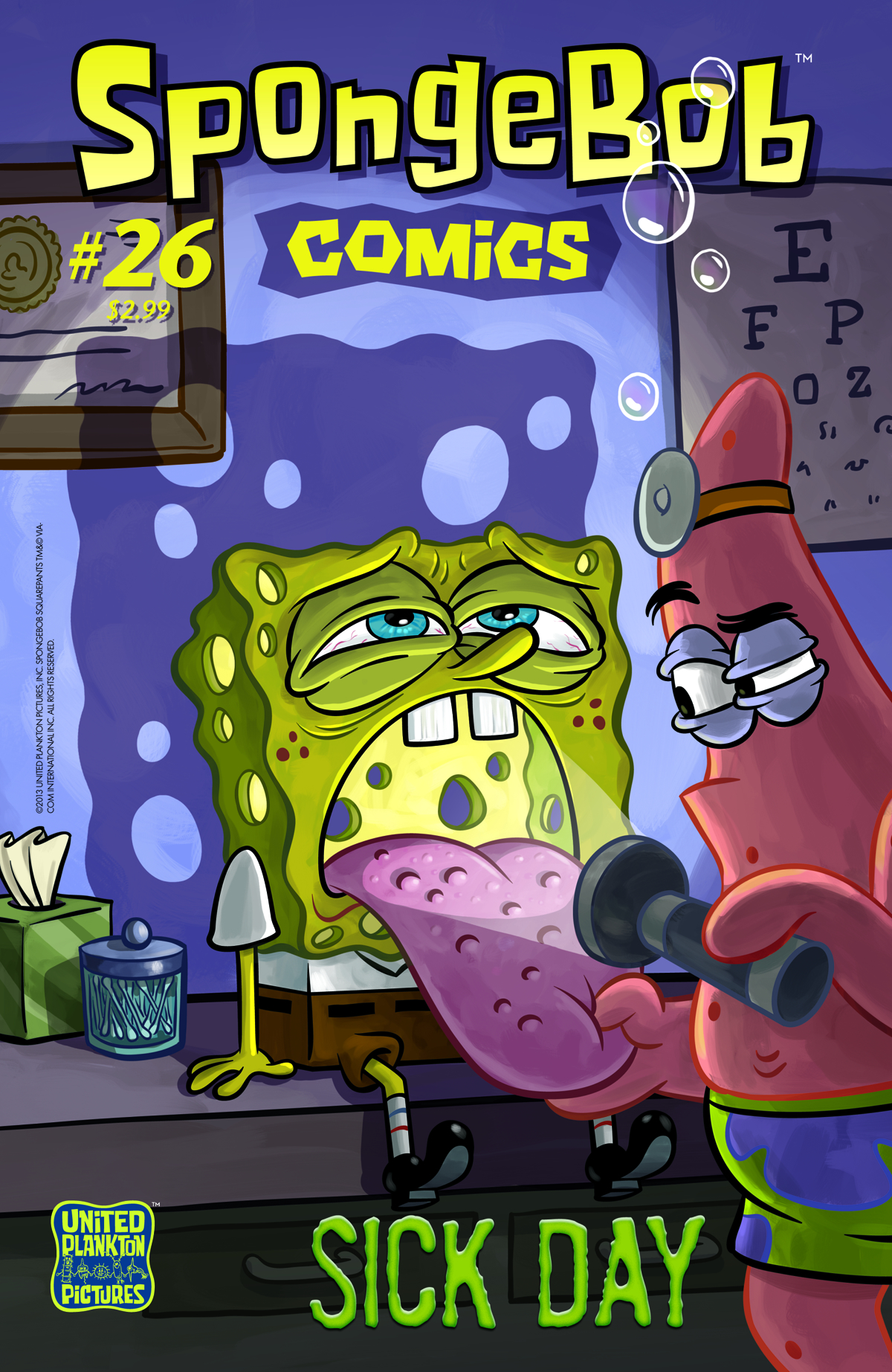 This issue is filled with sick humor! Because SpongeBob has a bad cold. And when his friends visit, things somehow get worse. Joey Weiser and Gregg Schigiel reveal all in "Sick Day." And in "Trench Vanilla," readers can experience a SpongeBob adventure in widescreen - that's right, it's a 10-page comic that is one continuous image! Enjoy this miracle of comic book technology courtesy of Robert Leighton and Gregg Schigiel. Plus: James Kochalka's "SpongeFunnies," David Lewman and Vanessa Davis' "Squidward in Love," Joey Weiser's "Phoney Dance Party," and Maris Wicks' "Flotsam and Jetsam."