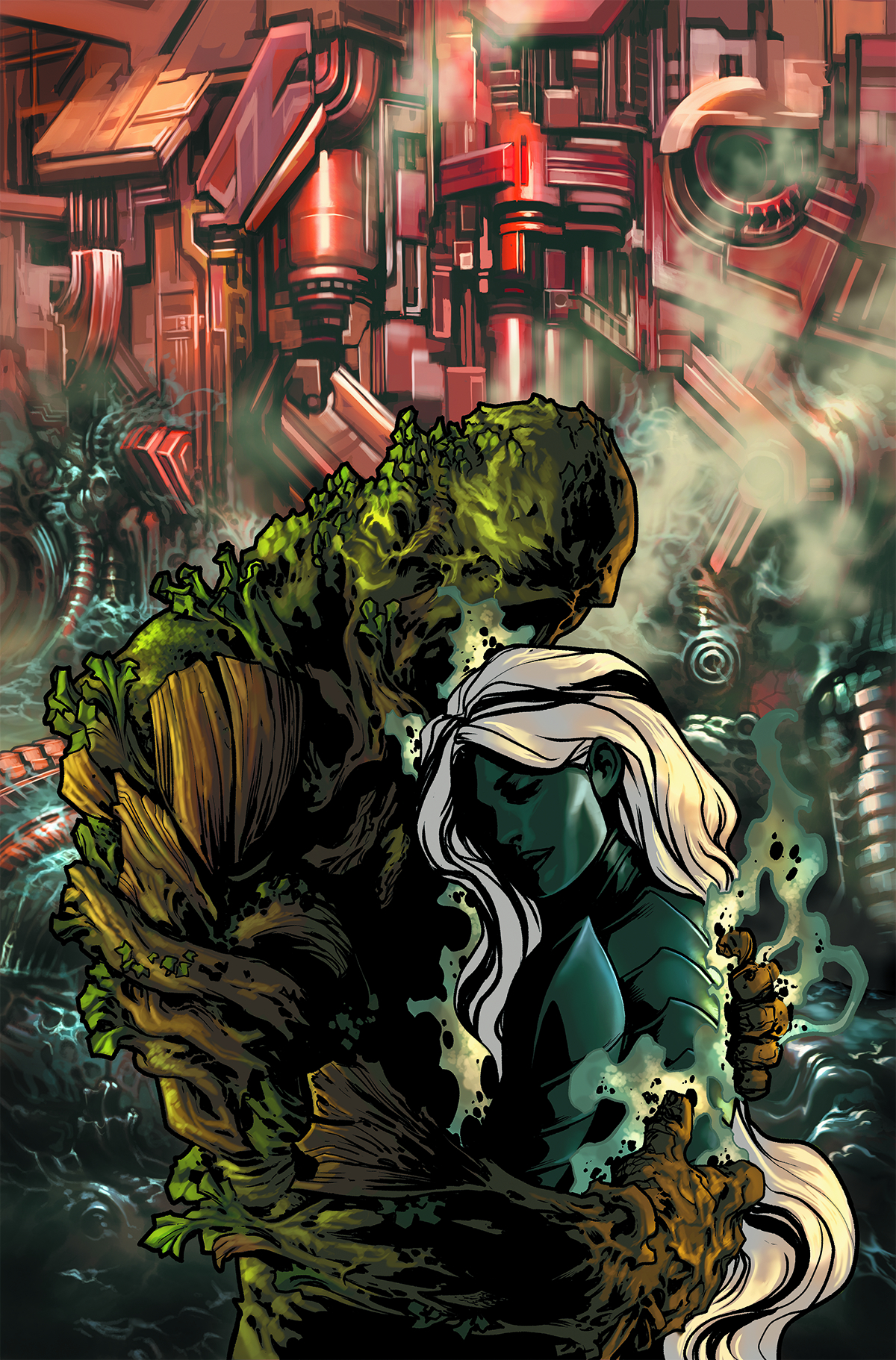 "THE MACHINE QUEEN," part 2: The Machine Kingdom is not happy with Swamp Thing, and the lines of battle are drawn! But Alec Holland has a humanity the Machine Kingdom lacks, and that gives him an edge...at least for now. Still, no man - not even a plant one - is an island, and Swampy must seek out his true love, Abigail Arcane! We hear the Rot is very nice this time of year...