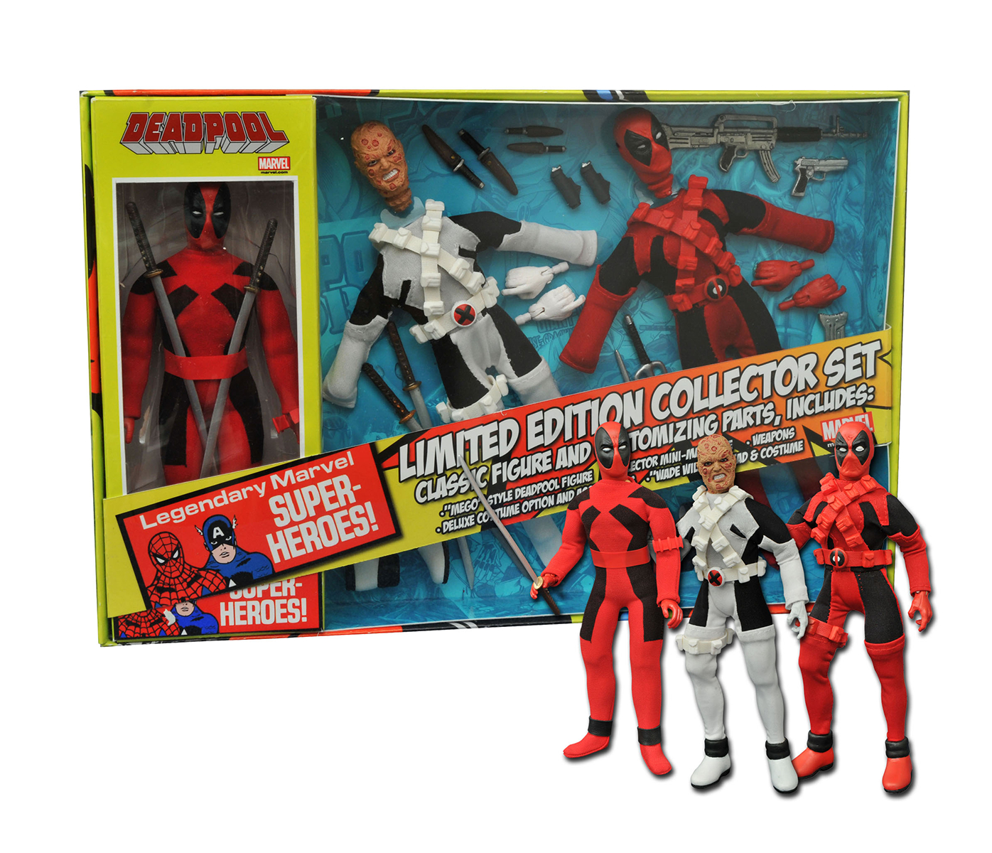 A Diamond Select Toys release! Remember that time in the 1970s when Deadpool got his own action figure? Neither does Deadpool! Realizing that a great injustice had been done, DST and EMCE Toys have teamed up to give the Merc with a Mouth the Mego-style 8-inch action figure he deserves. Arriving inside a retro-style window box, the figure is packaged in a tray alongside two bonus outfits - a more detailed, modernized Deadpool head and suit, and a white X-Force outfit with an unmasked head! Plus, more swords, guns and weapons than you can shake a taco at! Then take off all his clothes and have him dress him up in the costumes of your other Marvel Retro figures! Limited to only 3,000 sets.