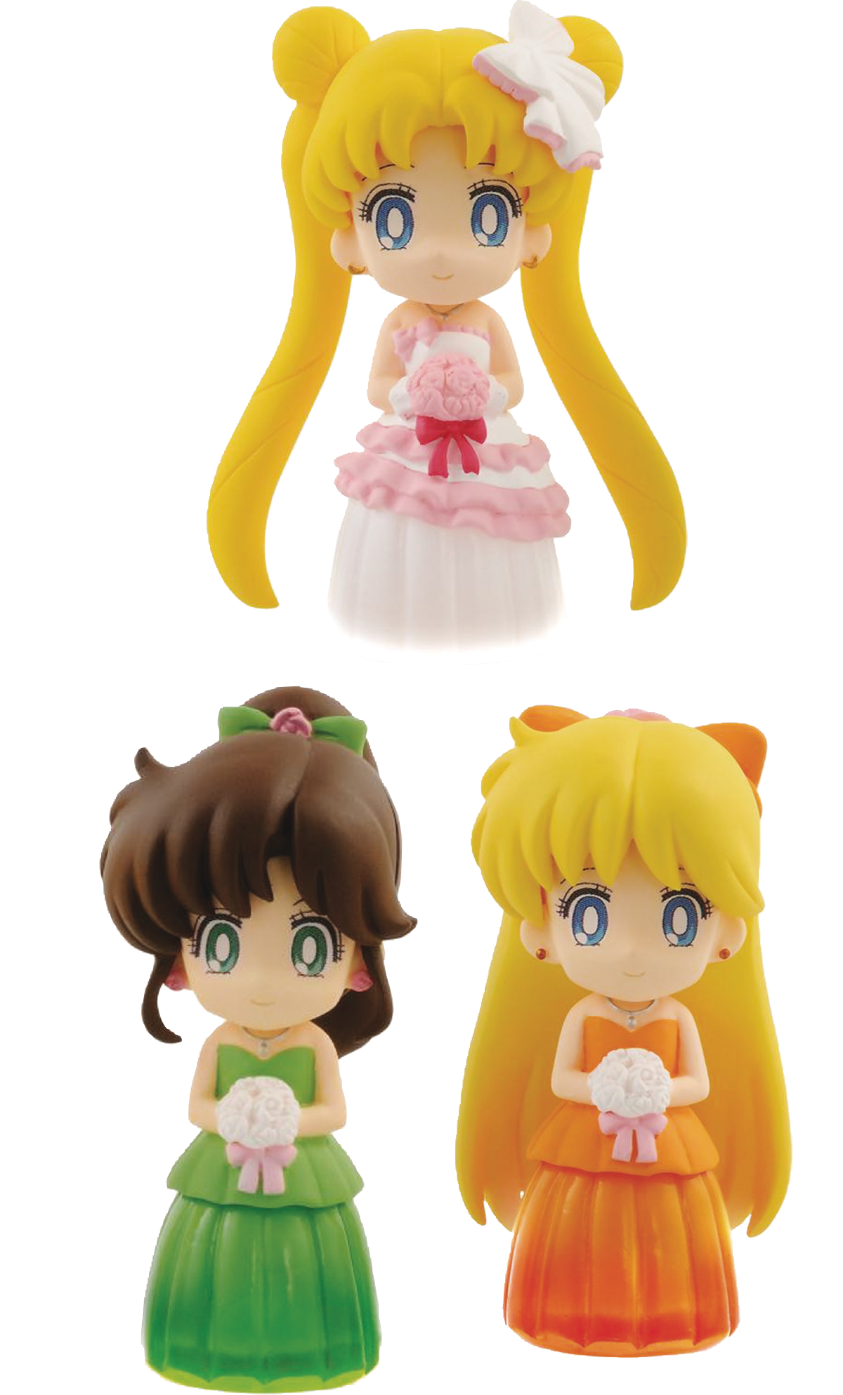 From Banpresto. In celebration of the 20th anniversary of the iconic anime and manga series, Sailor Moon, Bandai Import Collection proudly presents an all star cast in a very special figure collection. Each figure standing at approximately 2 3/8" tall, this Clear Colored Sparkle Dress figure series is made of Sailor Senshi key members Sailor Moon, Sailor Venus and Sailor Jupiter. Unlike any other collection, the dresses on these figures are made of a special translucent material infused with sparkle star action when given the spotlight! Minor assembly required.