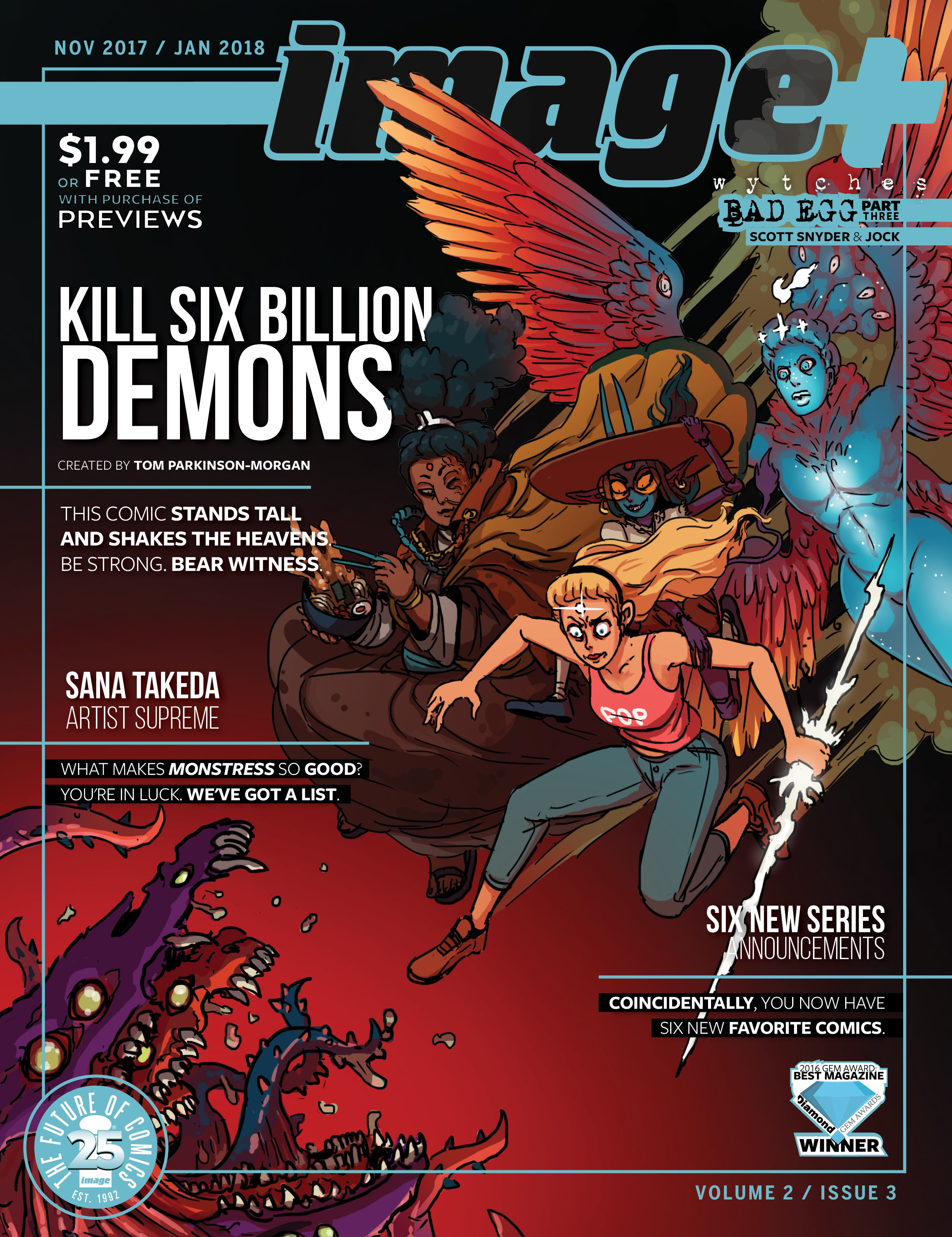 Volume two of the Diamond Gem Award-winning comics magazine IMAGE+ continues with all the hard-hitting content you love. This issue features another 80 pages of interviews, previews, and in-depth features, plus exclusive comics content. SCOTT SNYDER & JOCK's horror series WYTCHES continues with the third chapter of "BAD EGG", plus the continuation of ED PISKOR's "IMAGE OF YOUTH" strip, and even more of the unstoppable ATOMAHAWK, courtesy of DONNY CATES, IAN BEDERMAN & TAYLOR ESPOSITO.
