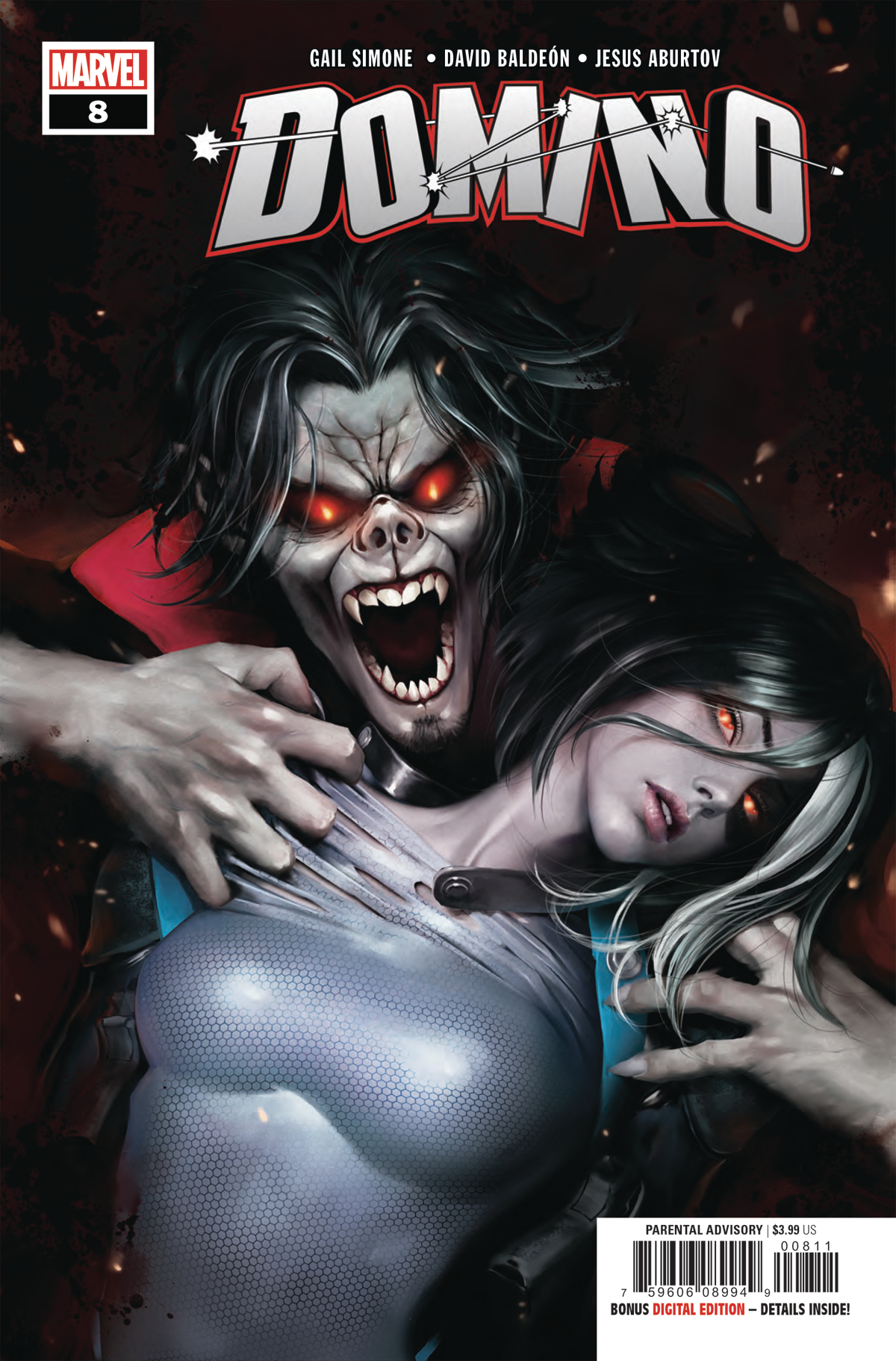 • Pale skin...long hair...skintight black bodysuit... No, not Domino...it's Morbius the Living Vampire!