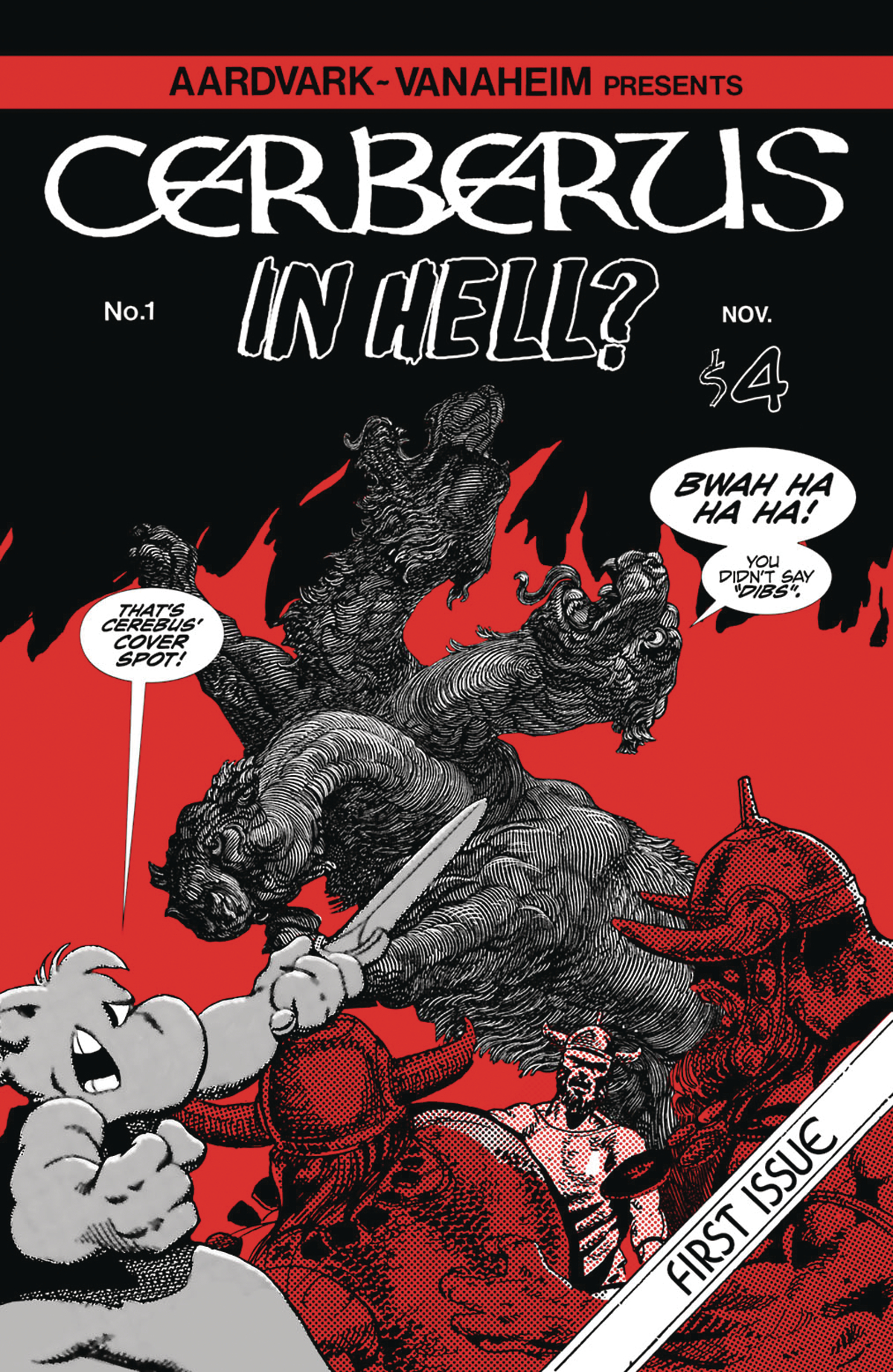 Three-headed Cerberus stars in his own title! Two of those three heads are criminally-actionable parodies. Guess who? Featuring Batvark as the Bassoon Fairy. Is Cerberus identifying as "bat-winged-demon curious"? Hell's Illegal Organ Market; Hell's Civic Improvement Health Committee; Hell's Green Economy Civic Improvement Committee; Is Cerebus short? Or Vertice-Specitic-Personal-Elevation Oriented? Or Height-Appropriate-Capacitation Statused? Cerebus has trouble digesting the Book of Jeremiah; Cerebus and the Whore of Babylon debate Kanye West; Cerebus seeks out company; Botoxing newborns: Is Big Pharma behind it? Or Mattel? Cerebus and an Arch-Demon Team-Up; Cerebus the Stand-up comedian; Why you don't want to tell the old "So, this pig asks a djinn to turn him into a human being ... " joke; Cerebus' computer is hacked; Friedrich Nietszche vs. Batvark (yes, again!); the Redeeming Power of the Cheers theme song; Also! Hillary Clinton isn't conceding just yet!