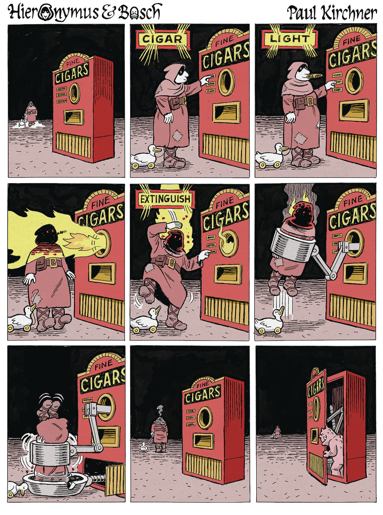 Meet the medieval miscreant Hieronymus and his wooden duck Bosch. Since their tragic-comic death they are both living in a cartoonish Hell where lakes are made of lava (or, more often, poop) and an army of mischievous spiky-tailed devils go around playing pranks on their inmates. Despite many gag-filled attempts at escaping this literal hell, Hieronymus and Bosch always end up being the butt of their guards' most humiliating and painful jokes. This book puts together about a hundred one-pagers filled with hilariously surrealistic and scatological gags by American comic book artist Paul Kirchner, inspired as much from medieval depictions of Hell as from the zany humor found in Warner Bros. cartoons such as the Road Runner Show.