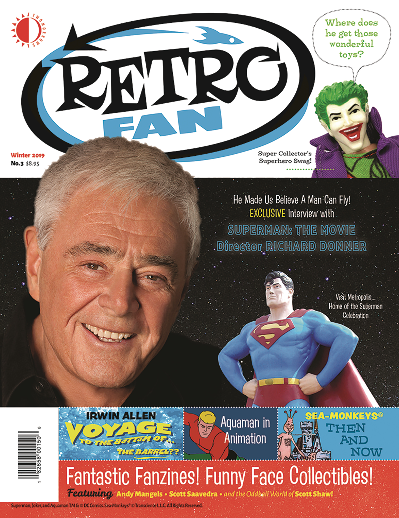 Superman: The Movie with an exclusive interview with Superman director Richard Donner! Martin Pasko's Pesky Perspective examines Irwin Allen's sci-fi universe! Andy Mangels dives in to Saturday morning's undersea adventures of Aquaman! Scott Saavedra flips through monster fanzines of the Sixties and Seventies! The Oddball World of Scott Shaw! unravels Marvel's wackiest product ever: Jim Salicrup and Marie Severin's Spider-Man and Hulk toilet paper! Retro Travel to Metropolis, IL, home of the Superman Celebration! Plus: Sea-Monkeys, Funny Face beverages and collectibles, a fortress of Superman and Batman memorabilia; and more fun, fab features!