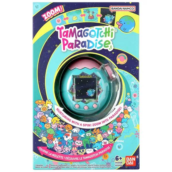 Tamagotchi Paradise and start in the Jade Forest!  Turn the zoom dial to take care of your Tamagotchi character from cell to space.  Zoom into the "New" Tamagotchi Planet for traditional nurturing play - clean the poop in the field, feed them delicious food, and make them feel better at the new "cell" level!  Plus, there's the  "Lab Mode" play with  mini-games, shop and nurturing activities!  Connect with friend's devices and unlock 2 other fields (Land and Water) for more play! Choose from nine languages (English, French, Spanish, German, Portuguese, Italian, Chinese, Korean and Japanese).   Requires 2-AAA batteries (sold separately).  Ages 6+.