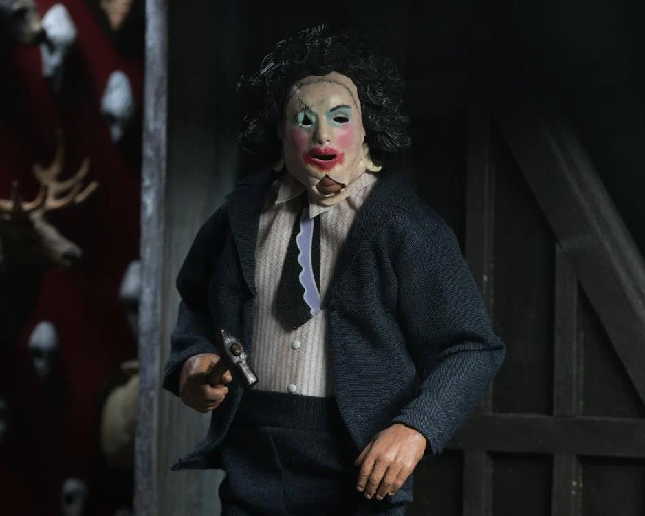 Leatherface in his Pretty Woman mask! The legendary killer comes dressed in tailored fabric clothing honoring the retro-style clothed action figures of the past. Donning his classic blue suit and infamous mask, this fully articulated, 8-inch figure includes his iconic chainsaw, an alternate hand, short hammer, knife, and bracelet accessories. Leatherface is all dolled up and ready to join your next family dinner! Comes in collector-friendly window box packaging.