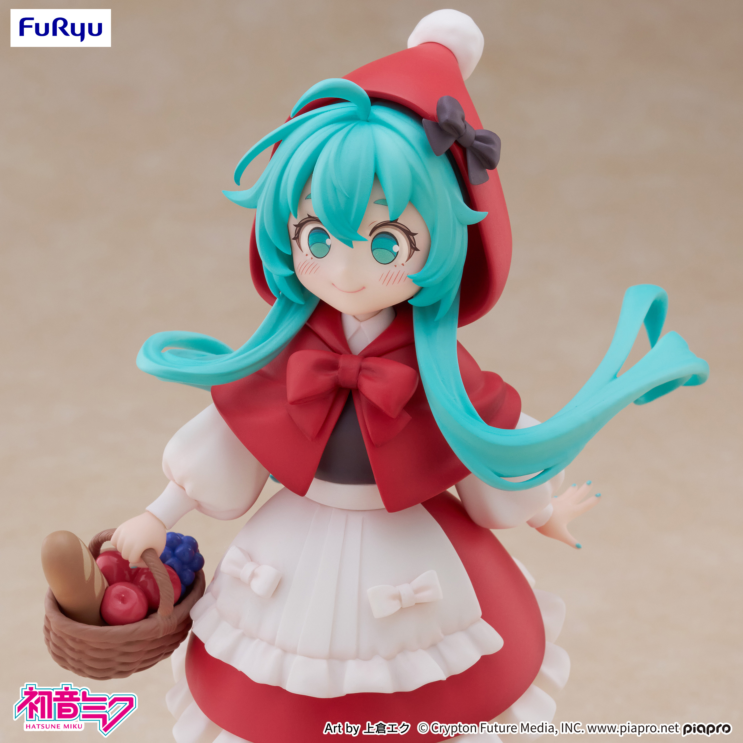 From FuRyu. Let Hatsune Miku brighten up your desktop with the Hatsune Miku Little Red Riding Hood Desktop Fairy Statue! Dressed in a red hooded cape, this non-scale figure features a cute chibi style and measures 6.3" tall.