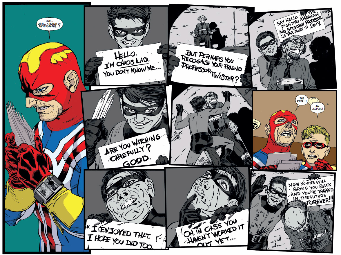 Chaos reigns in the last two pages of Fighting American #1 from Titan Comics! The death of a beloved Simon & Kirby character from the original series leaves Fighting American & Speedboy marooned in the strange future world of 2017.