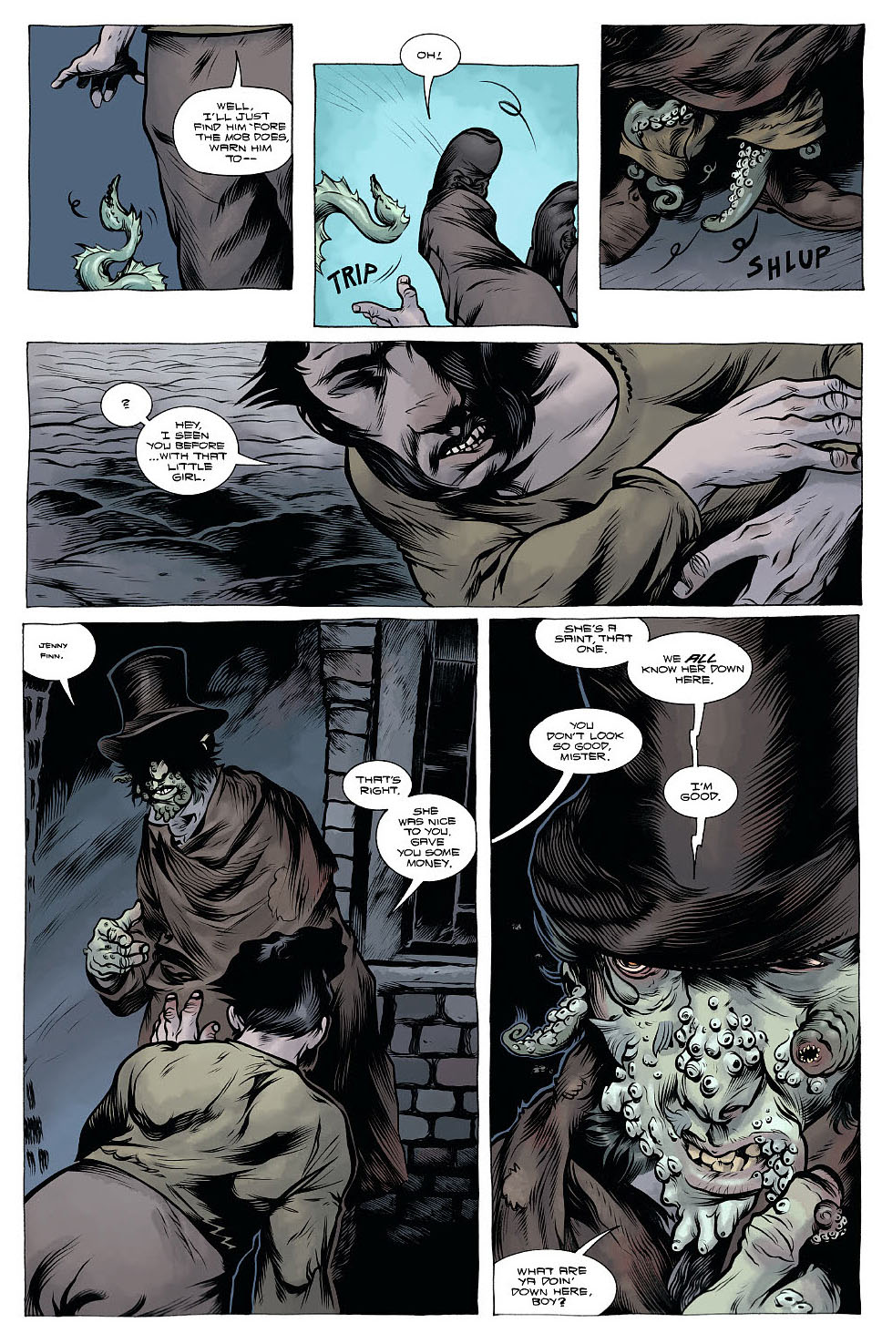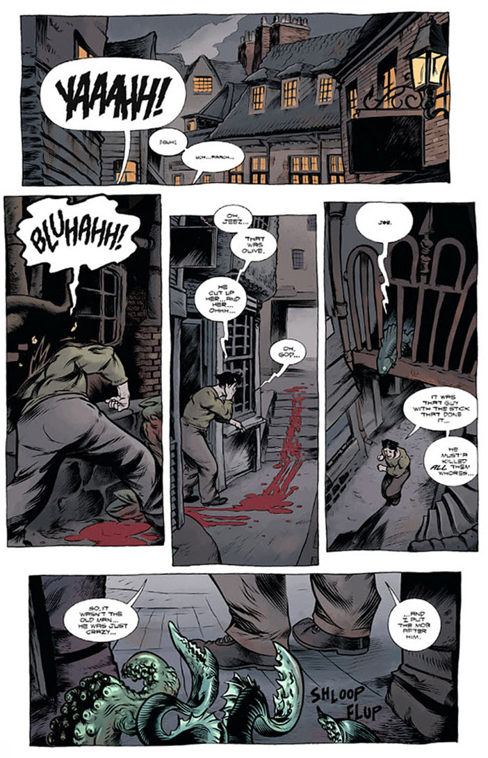 Vince Brusio: A two-page preview is shown in the September PREVIEWS catalog. Can you give us a blow-by-blow description of what we’re seeing? A man is seen vomiting in an alley somewhere in London, and the next thing he knows he’s tripped up by a tentacle. So how does this preview foreshadow the dark things that are yet to come?