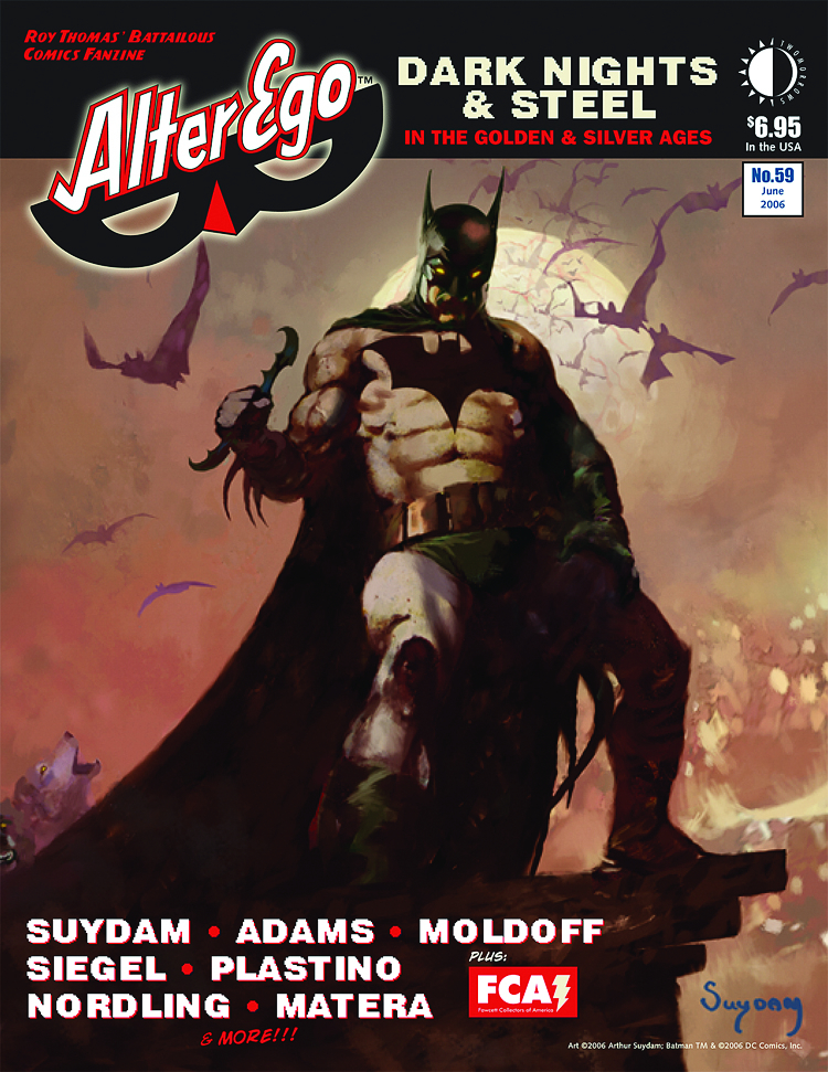 This issue spotlights "Dark Knights and Steel" with Batman, Superman, and more in the Golden and Silver Ages! Behind a fabulous new painted Batman cover by award-winning artist Arthur Suydam, modern legend Neal Adams discuss the 1960s/70s of DC comics, Shelly Moldoff enlightens readers on