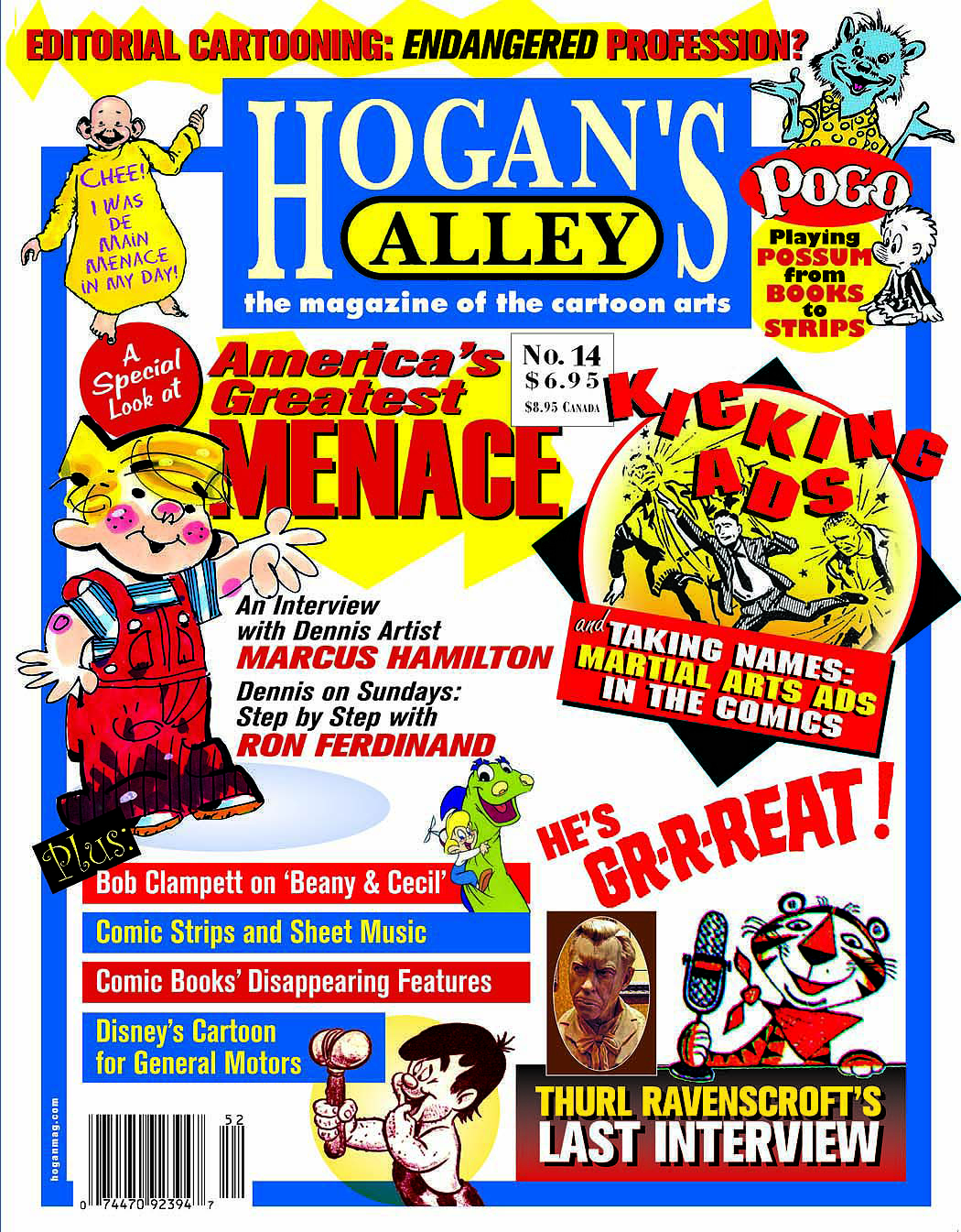 Hogan's Alley features an in-depth examination of martial arts ads in comic books in the 1960s and 1970s, a phenomenon that has not been explored properly - until now! Learn the stories of the psychos, frauds and charlatans (including the immortal Count Dante) who wanted to teach you the deadly fighting secrets of Asia and give you the power to turn the tables on your schoolyard tormentors! Also explores Pogo Possum's evolution from Walt Kelly's scraggly band of swamp crittler to the better known appearance of the comic strip.