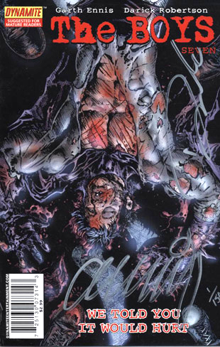 Signed by Garth and Darick! The series continues as Butcher takes Wee Hughie to meet the Boys' greatest weapon against the Supes: a man called "The Legend." Plus, meet the troubled hero Tek Knight - a man with a problem so unusual you'll have to read this comic to believe it!