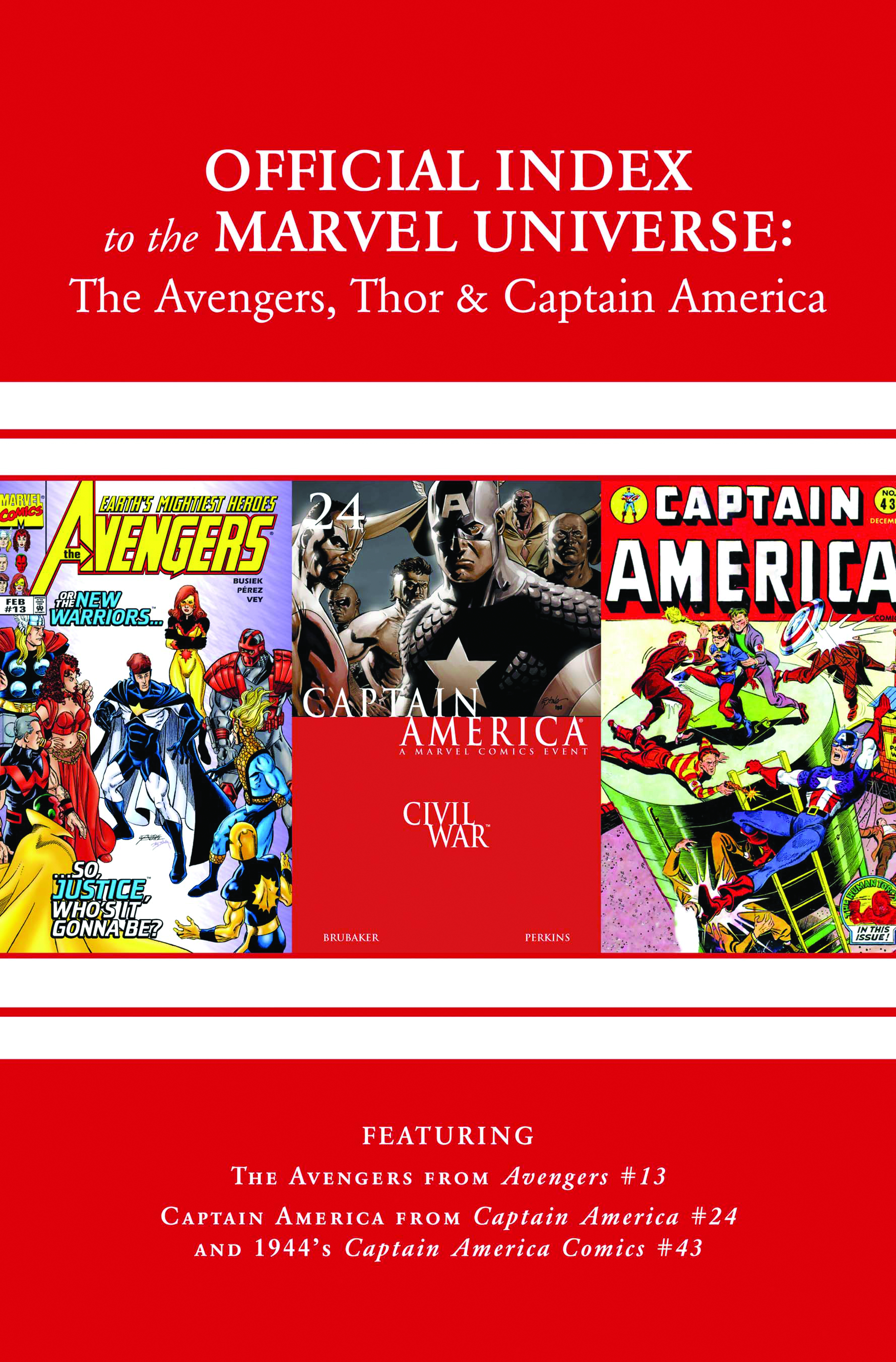 The chronicle of the Marvel Universe continues its coverage of the Avengers (from 1999's AVENGERS #13) and Captain America (from both 2004's CAPTAIN AMERICA #24 and 1944's CAPTAIN AMERICA COMICS #43). Watch the Marvel universe's history unfold month by month as we provide synopses for dozens of individual comics, including back-up strips - introducing the characters, teams, places and equipment that appeared within with vital information about first appearances, where they last showed up and where they appeared next!