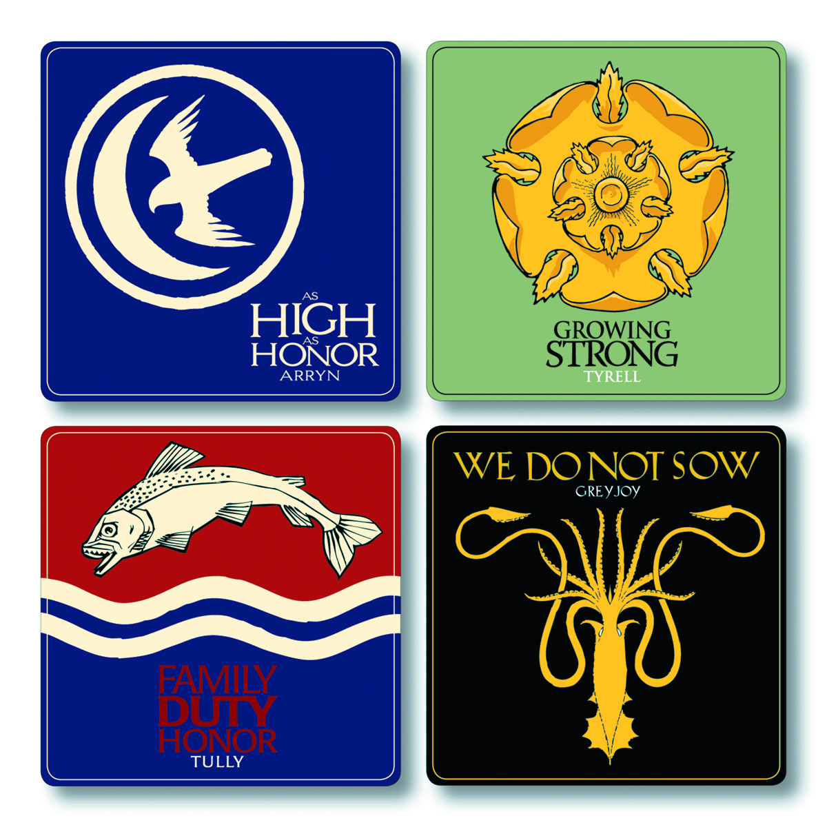 As HBO heads into season 2 of the award-winning television series Game of Thrones, we continue our line of products featuring the sigils of the various families. We offer two patches, a mug, and a coaster set, which includes four coasters with the sigils for Greyjoy, Tully, Arryn, and a new Baratheon sigil, as seen in season two.