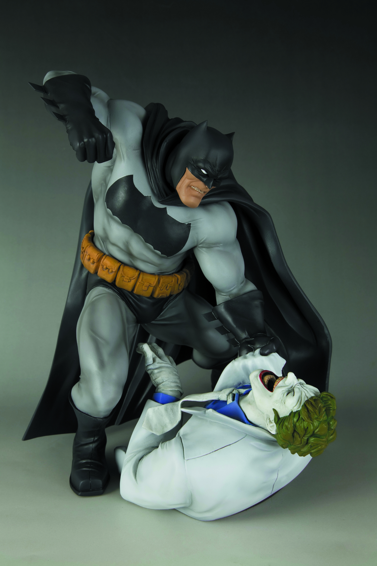 Frank Miller's Dark Knight Returns Batman is much thicker and heavier than most representations of the character, and that's quite apparent here. The bulky Dark Knight kneels over the prone Joker, holding him down with one hand on his collar while pulling the other back in preparation for the final strike! Perfectly recreating the artwork, the statue is intricately detailed with special attention to Batman's powerful musculature, the rumpled clothing of the evil clown, the furious expression on the dark hero's face, and of course Joker's maniacal laughing. The painting too reflects Miller's artwork with stark colors and bold strokes.