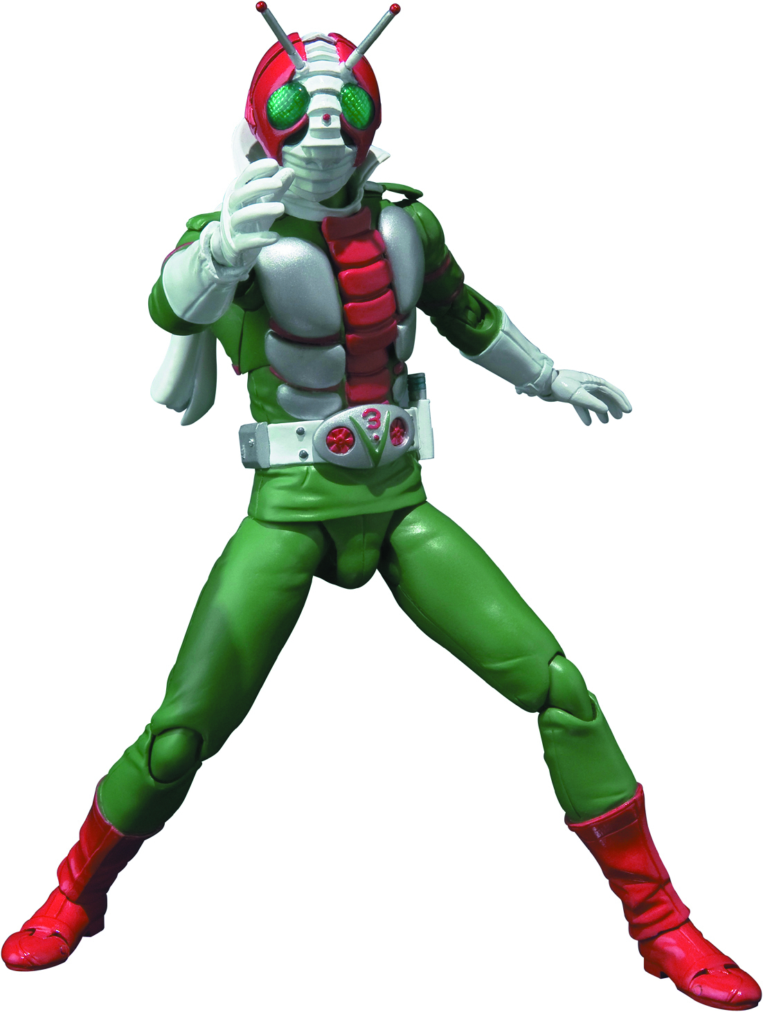 Masked Rider V3 kicks his way into the S.H.Figuarts line. This figure will feature a full array of accessory parts to enable dynamic action scene posing. This advanced action figure set will include 1 set of left/right scarves, 7 types of interchangeable right hand parts, 4 types of interchangeable left hand parts, rider kick effect parts, V3 Hopper, and interchangeable V3 hopper holster. Window box packaging.