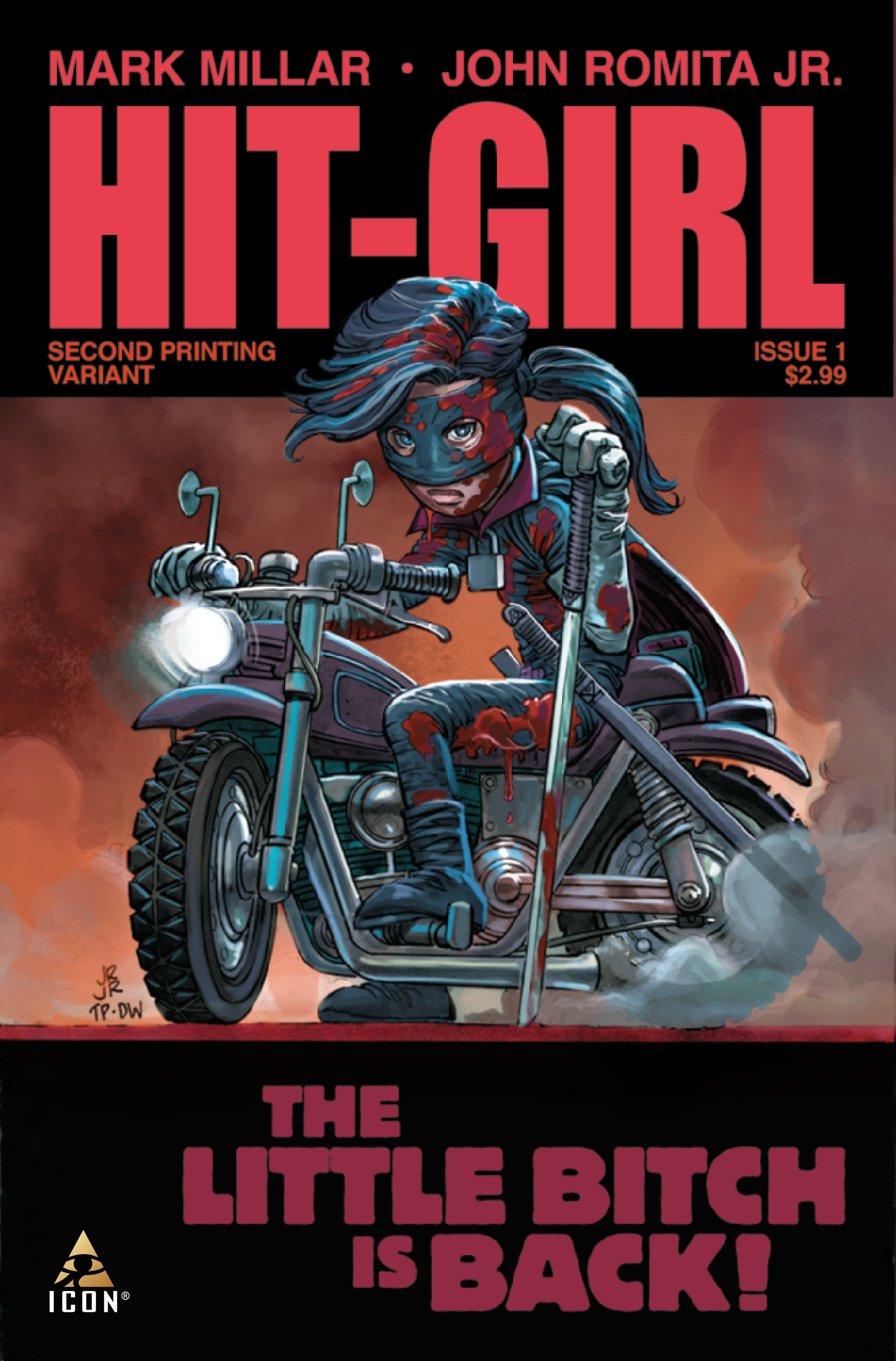 Hit-Girl spins off into her own blood-soaked series by the sales-busting creative team of Mark Millar and John Romita Jr. This story takes place between Kick-Ass Volumes 1 and 2 as Mindy McCready tries to settle into life as a regular school-girl, but wants nothing more than to be dispensing hot justice to the scum of New York City. Her mother and step-father think she's doing her homework, but in reality she's taken Kick-Ass on as her sidekick and is training him up to punch, shoot and stab ... just like Daddy would have wanted.