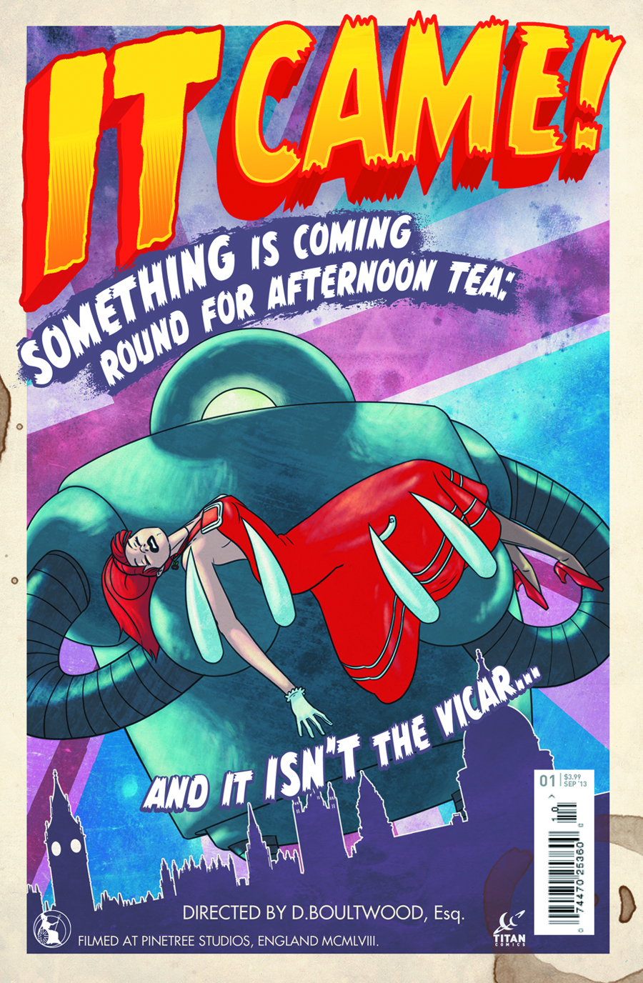 It Came!, Dan Boultwood has unearthed a lost classic from the forgotten Pinetree Studios. An enormous alien robot lays waste to the English countryside, annihilating bunting, villages, and diagonally-sliced sandwiches alike! Only the pipe-chomping space scientist Dr. Boy Bret and his assistant Doris Night stand a chance of stopping it from marching all the way to London!