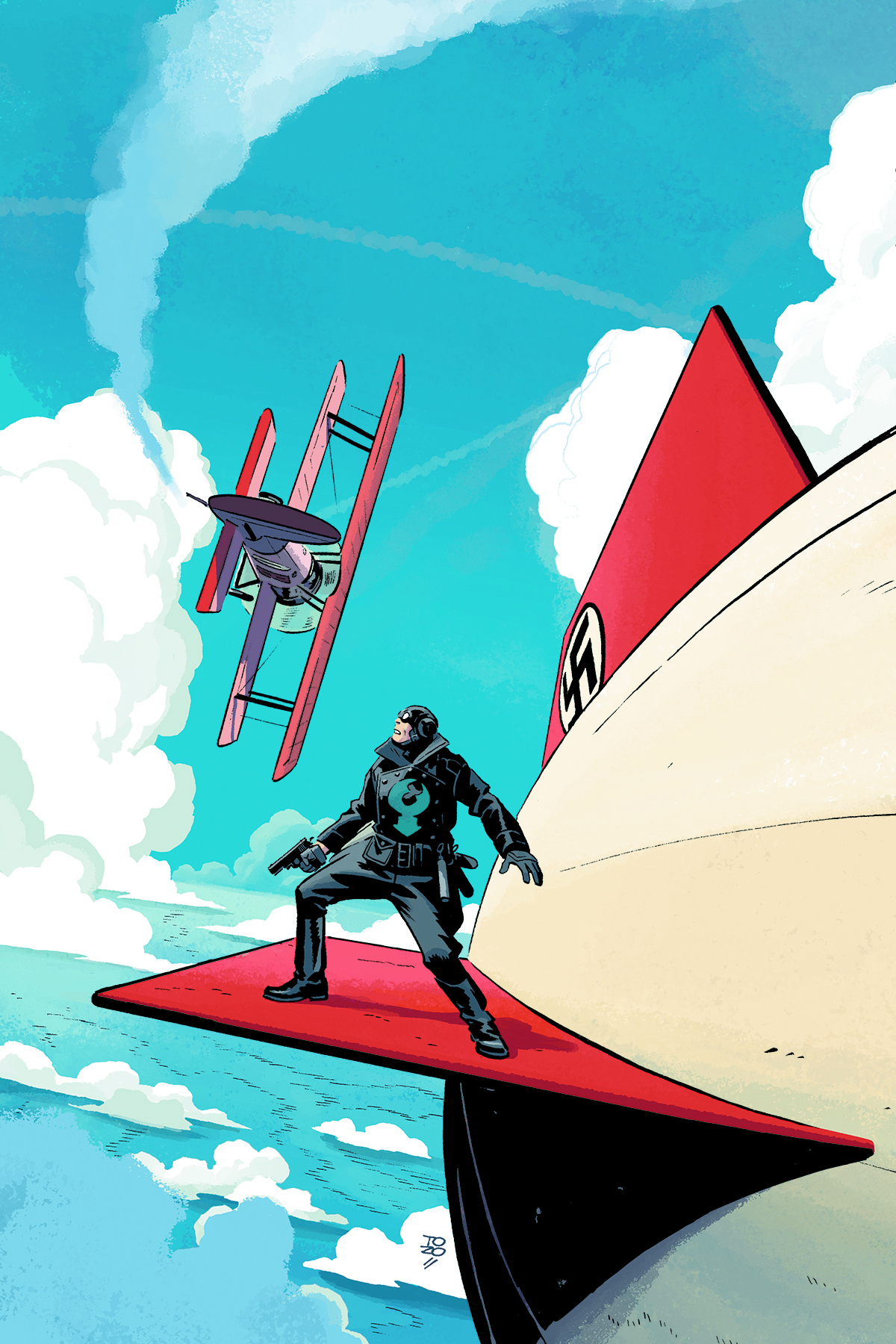 The Lobster engages in a firefight with a madman in a biplane on top of a zeppelin!
