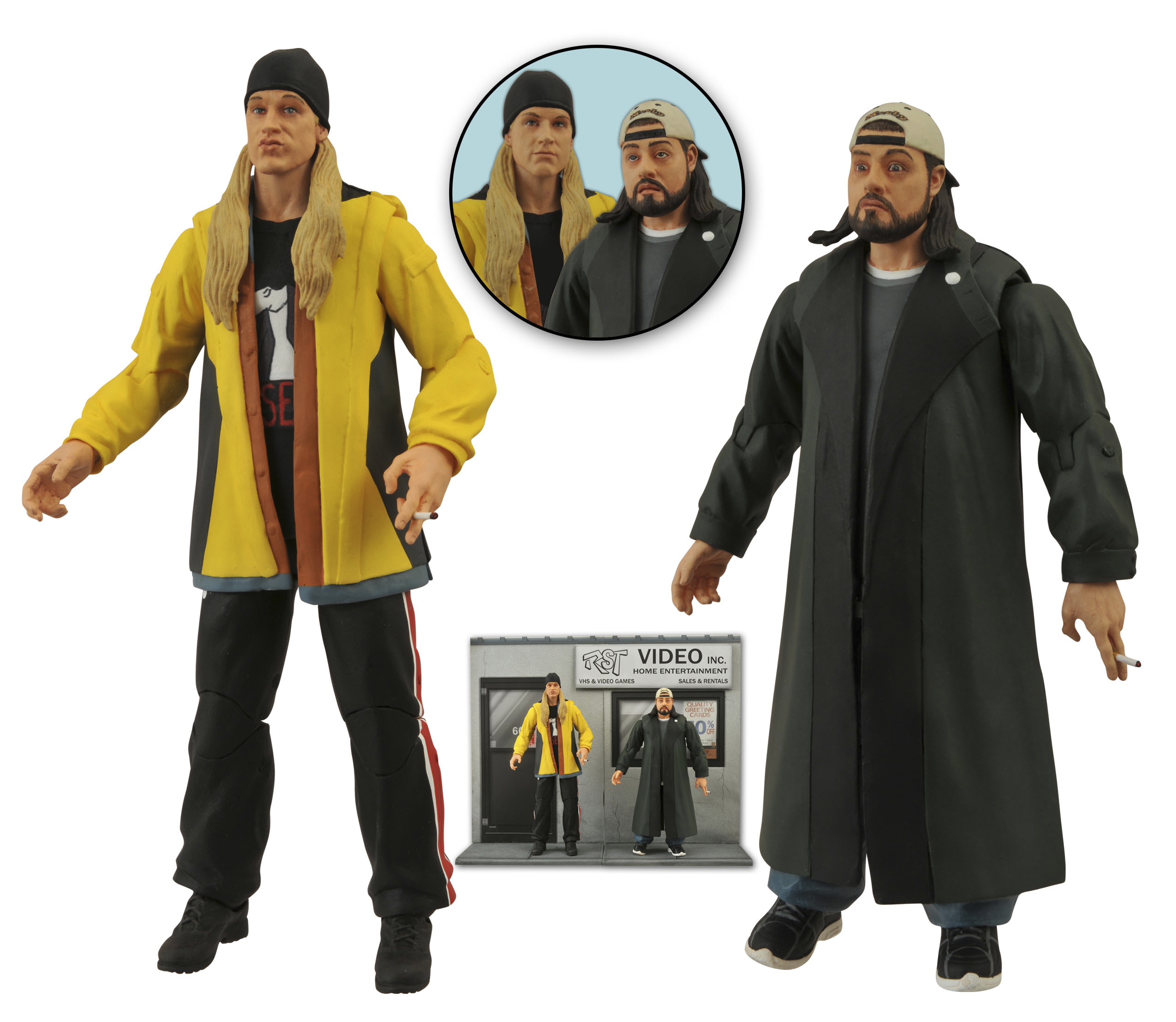 A Diamond Select Toys Release! It's been 20 years since we met Jay & Silent Bob in Clerks, and DST is celebrating the less-than-dynamic duo's anniversary with their most realistic action figures ever! Based on their appearances in Jay & Silent Bob Strikes Back, these 7-inch scale figures include multiple interchangeable parts, multiple points of articulation, and connecting display bases depicting the interior and exterior of RST Video. Packaged in Select-style display packaging, with spine artwork. Sculpted by Patrick Piggott!