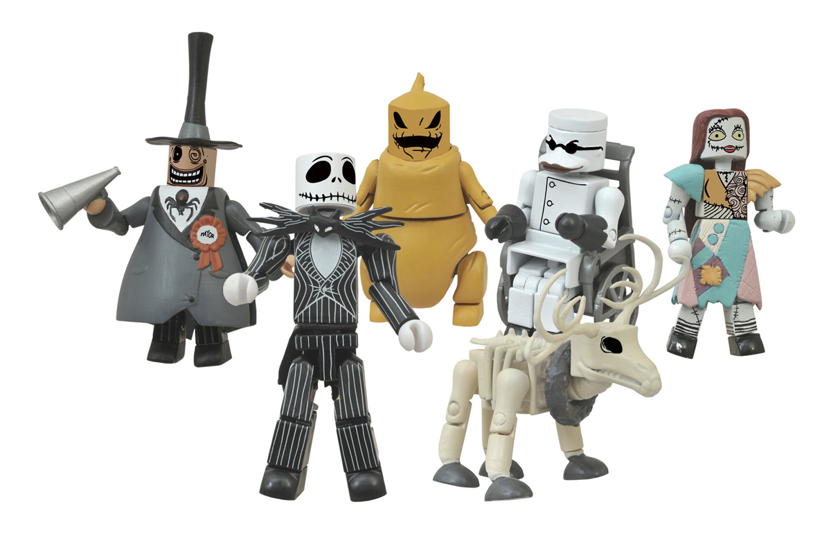 A Diamond Select Toys release! Christmas is coming early this year! Each foil-bagged mini-figure in our display of Nightmare Before Christmas Minimates is like a little present to open, and there are eight different figures you can get! The first series includes Jack Skellington, Sally, Oogie Boogie, The Mayor, Dr. Finkelstein, and three exclusive figures - a Skeleton Reindeer, a glow-in-the-dark Jack, and a rare, one-per-case glow-in-the-dark Sally! With 18 packs to a display, there's a full set in every one!