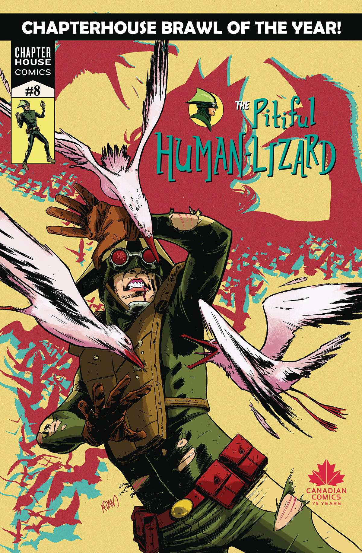 What happens when the most feared criminal mind from Nova Scotia faces off against Hogtown's adhesive protector? Cubicles get smashed and interdimensional portals get opened, that's what! From the Pages of True Patriot, the handsome hands of Jason Loo, and the lead-paint-chip-addled mind of Fred Kennedy comes ... Gull Girl versus The Pitiful Human Lizard!.