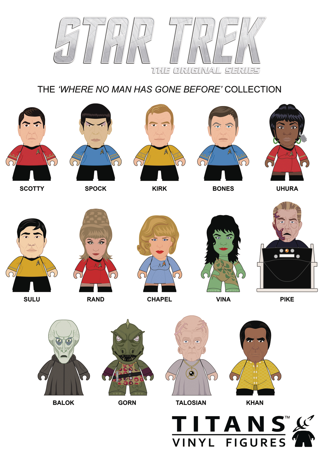 Star Trek Titans: The Original Series Season One - The "Where No Man Has Gone Before" Collection features characters from the first season of the groundbreaking science-fiction phenomenon led by the unforgettable trio of Captain James T. Kirk, Mister Spock and Doctor Leonard "Bones" McCoy! All of the iconic bridge crew from season one are represented in this debut blind-boxed Titans wave (Uhura, Sulu, Scotty, Nurse Chapel and Yeoman Rand) - alongside classic Season One nemeses such as the mysterious Balok, the manipulative Talosian Keeper, the terrifying Gorn and the legendary Khan Noonien Singh. Each figure is 3" blind-boxed and certain pieces come with a character-specific accessory.