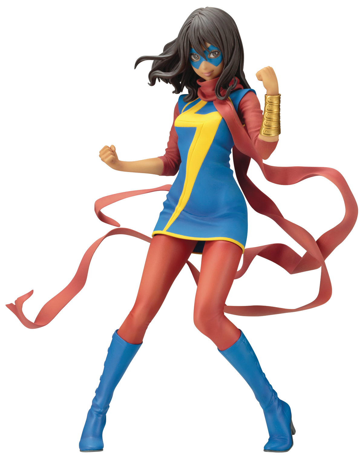 This beautiful sculpted 1/7-scale statue is based on a new character interpretation and illustration by Shunya Yamashita. Ms. Marvel stands ready for action in her blue and red outfit, scarf tails trailing behind her.