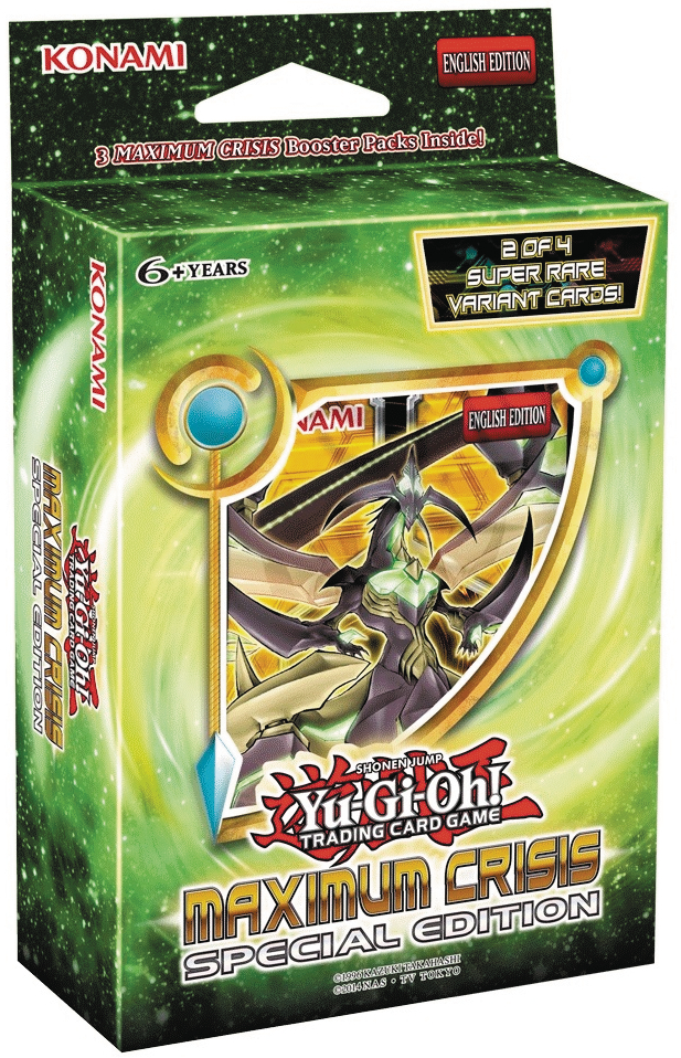 Yu-Gi-Oh! Trading Card Game contains three Maximum Crisis Booster Packs, 1 of 2 foil preview cards of non-foil cards from the Summer 2017 booster set, and 1 of 2 variant foil cards. 10-decks per display.