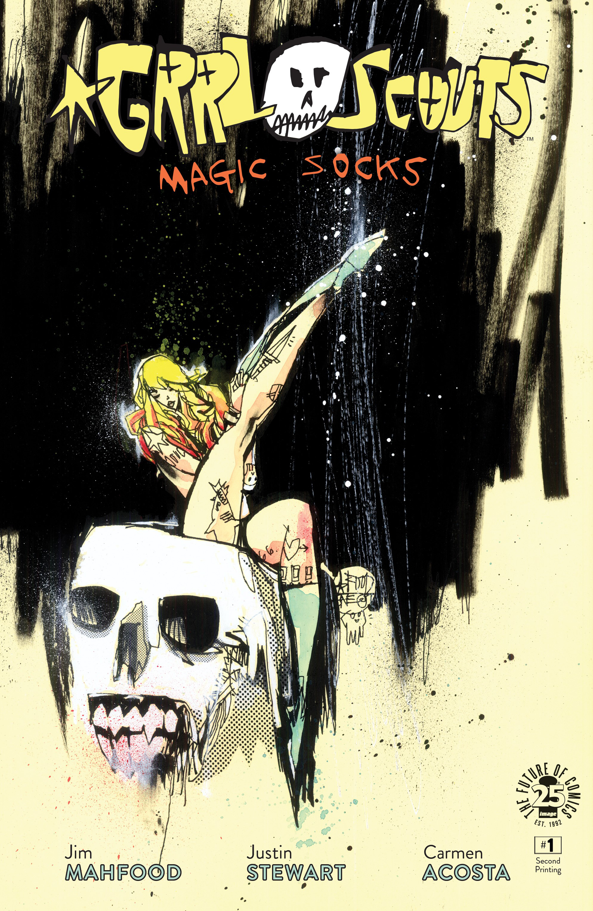 JIM MAHFOOD (Tank Girl, Clerks) debuts his first new creator-owned work in years with the glorious return of GRRL SCOUTS! Join Gwen, Daphne, and Rita as they reunite for a pulse-pounding psychedelic adventure through the streets of Freak City. This first issue is stuffed to the gills with an action-packed story, bonus art, soundtrack, sketchbook, and a behind-the-scenes comic thingy. Plus, a variant cover by the one and only SKOTTIE YOUNG! Pure fun! Pure flavor!