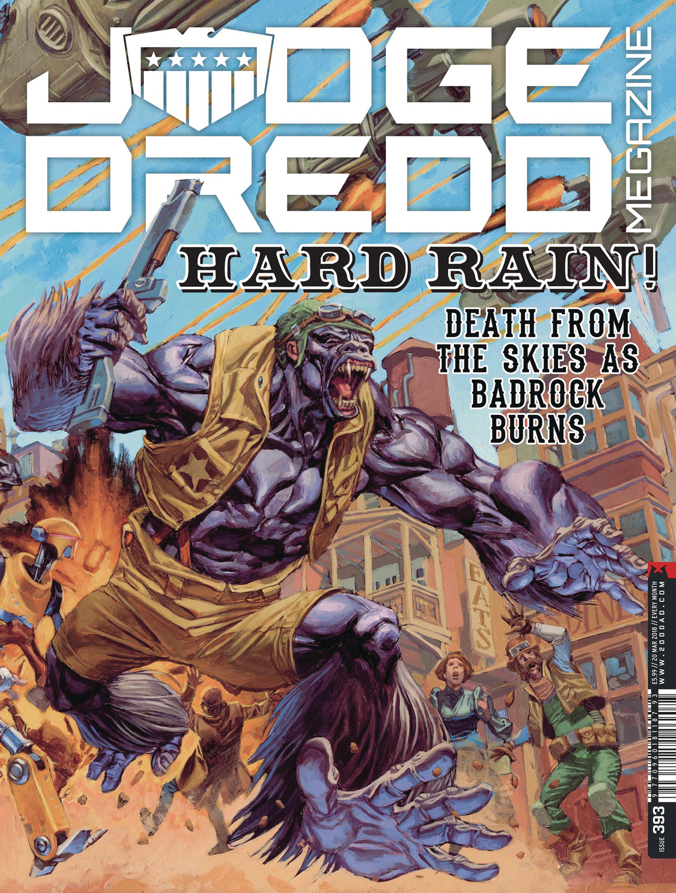 More action and adventure in the future-shocked world of Judge Dredd! The lawman battles demons from a nightmare dimension in the epic Razorjack crossover "This Corrosion" by Michael Carroll and John Higgins; Devlin Waugh returns and gives his date a night he won't forget in new story "Kiss of Death" by Rory McConville and Mike Dowling; the mysterious temple sheds more secrets in "The Returners" by Si Spencer and Nicolo Assirelli; a terrible threat arises from Uluru in Chopper: "Wandering Soul" by David Baillie and Brendan McCarthy; and an author has uncanny predictions in
