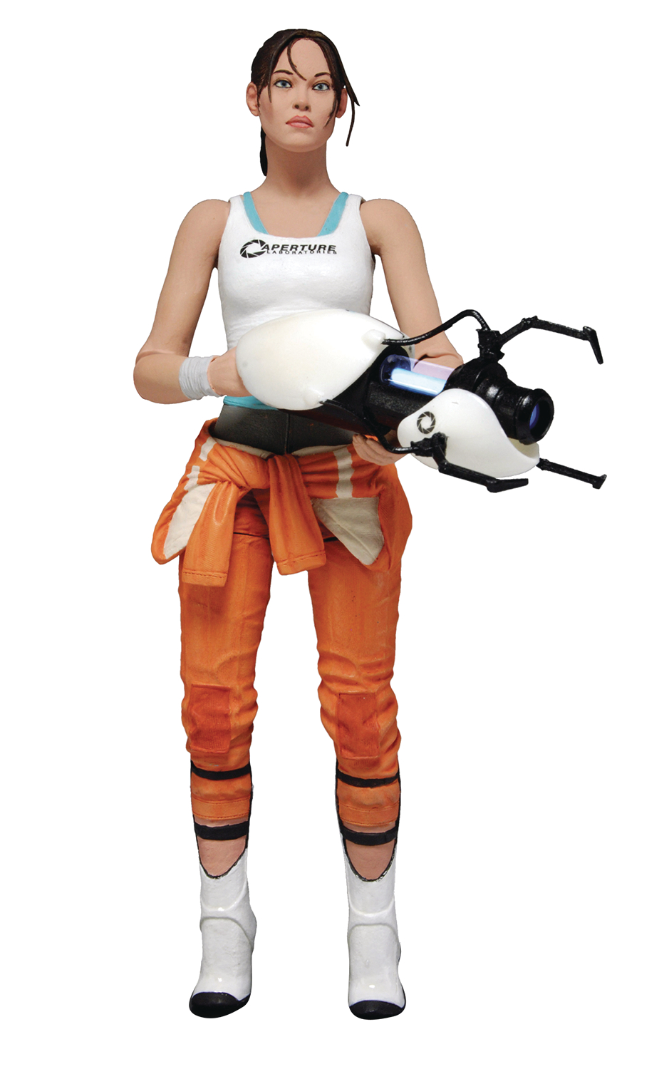 The most wanted and requested Valve figure is finally a reality! The protagonist Chell comes highly detailed in her orange Aperture Laboratories Jumpsuit. Chell is fully poseable with over 20 points of articulation and a display base. Articulation includes ball jointed neck, shoulders, torso, and wrists along with insert molded ball hinged elbows and knees and more. Even more impressive is her ASHPD accessory which actually lights up and glows blue just like in the game and as seen in the full size ASHPD prop replicas.