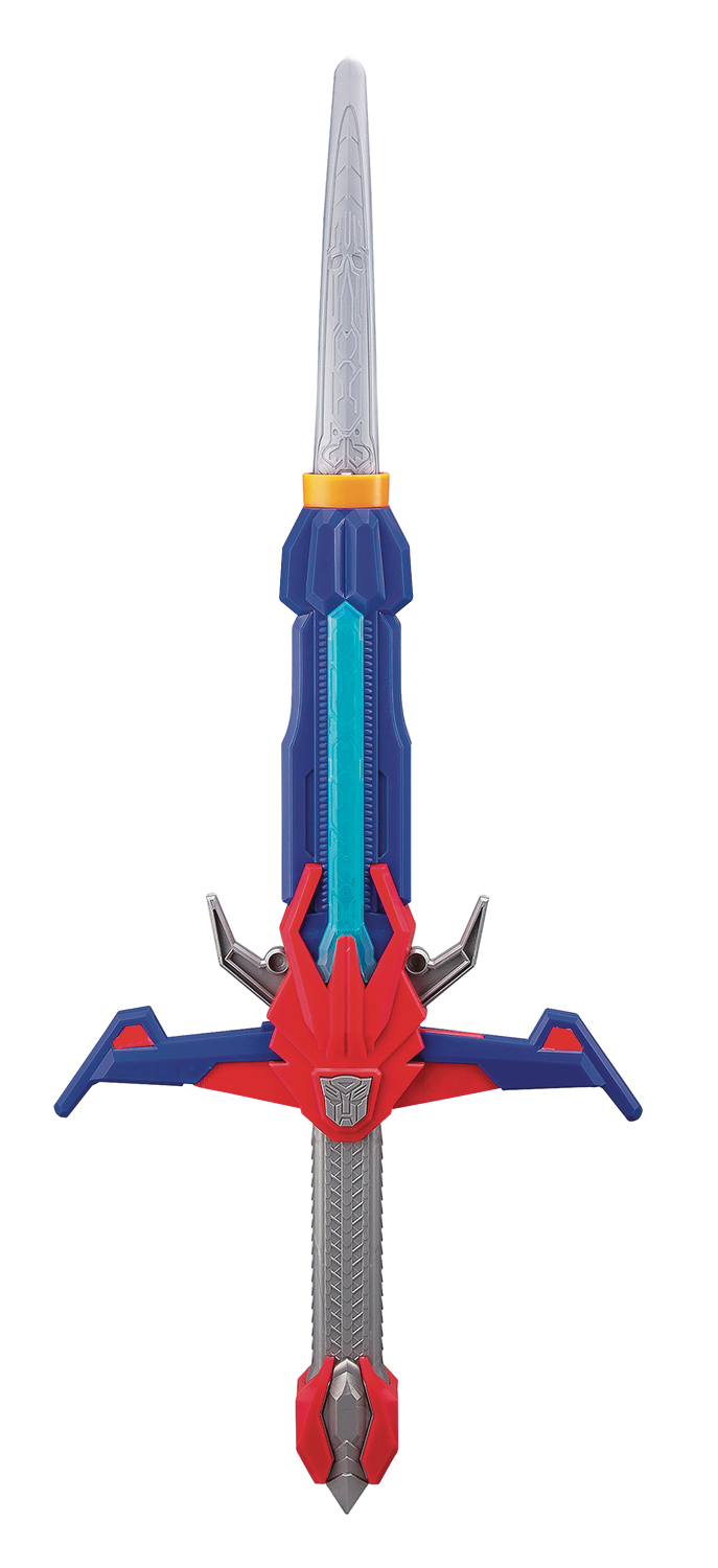Transformers: The Last Knight Optimus Prime Battle Blaster Sword. And just like the transforming Autobot robot, this roleplay weapon also has a transforming feature. It goes from blaster to sword in just a few steps. As a sword, it has a motion sensor so that every time you swing it around, lights and sound effects will play. You can also press the Transformers logo button to extend the tip of the sword and activate more battle sound effects and Optimus Prime phrases! In Blaster mode, every time you pull the trigger, the blaster will light up and play sound effects and Optimus Prime phrases!